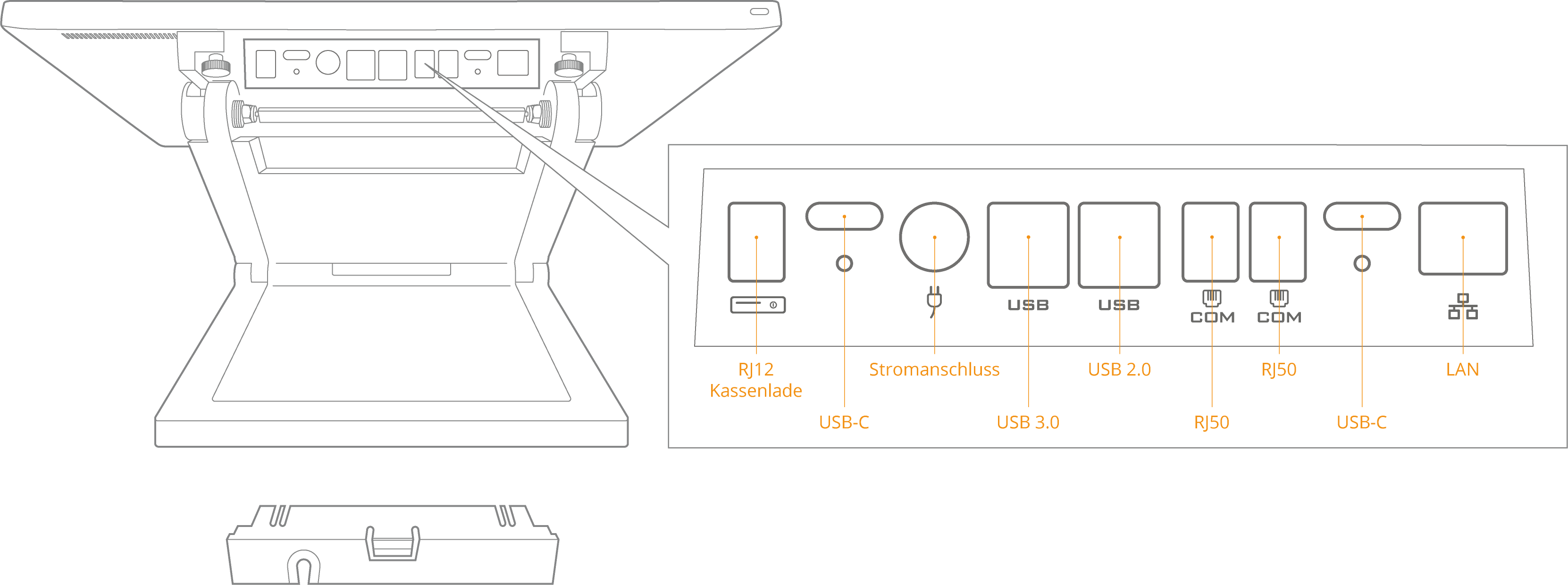 Über den USB-C Anschluss werden Peripherie Geräte mit der Kasse verbunden. Wie der Drucker und das Kundendisplay korrekt angeschlossen wird, erfahren Sie weiter unten.