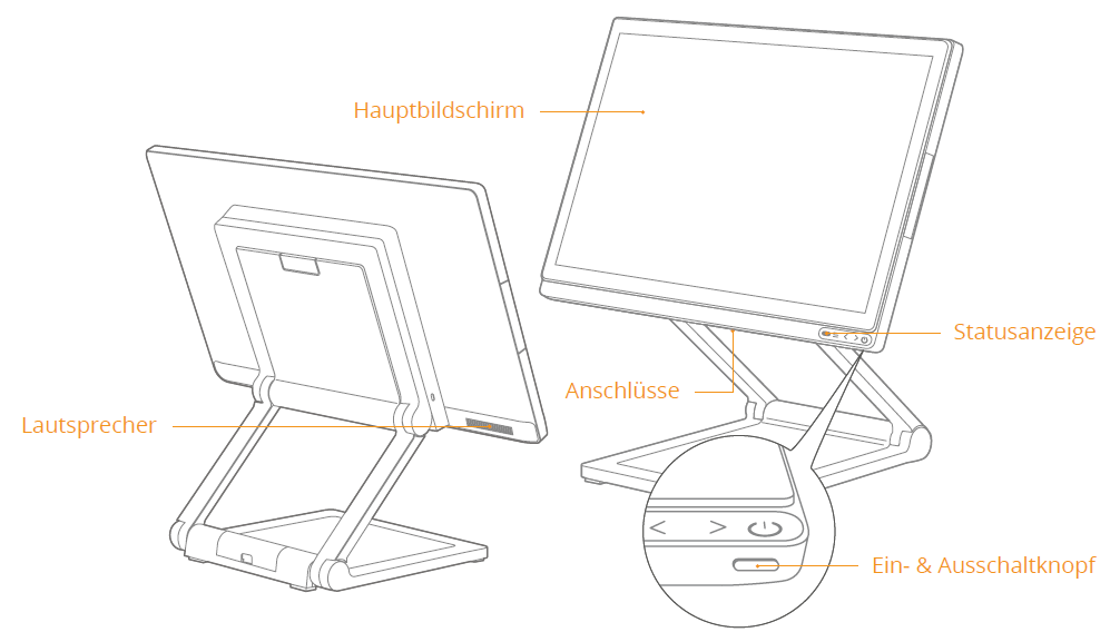 Zum Einschalten des Kundendisplays drücken Sie den kleinen Knopf auf der rechten unteren Seite des Displays. Um das Kundendisplay auszuschalten, Knopf wieder drücken.