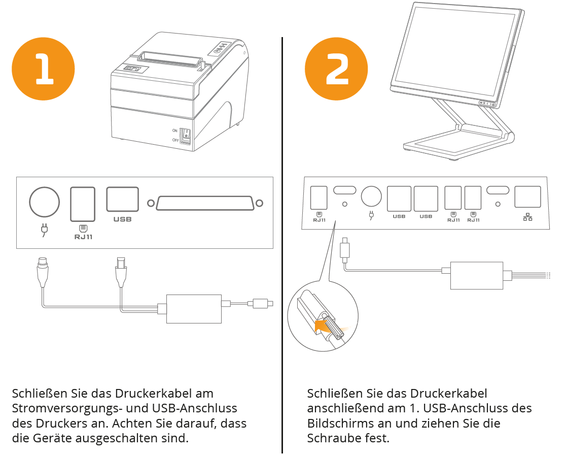 Versorgt den Drucker über den Anschluss zum Bildschirm mit Strom. Stecken Sie das Druckerkabel zuerst am Drucker und dann am Bildschirm an.