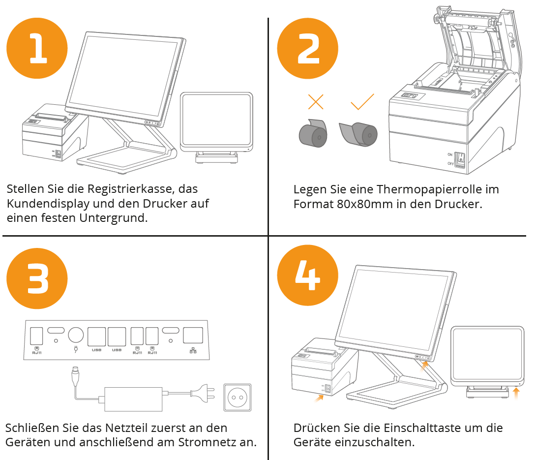 Bevor Sie Ihre primasello Registrierkasse in Betrieb nehmen, lesen Sie sich die mitgelieferte Schnellstartanleitung sorgfältig durch. Alternativ können Sie alle wichtigen Hinweise auch im Kapitel Start nachlesen.