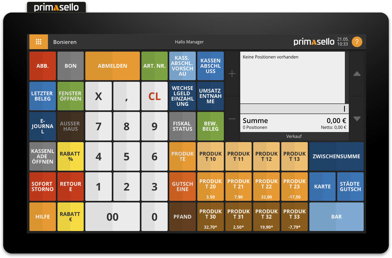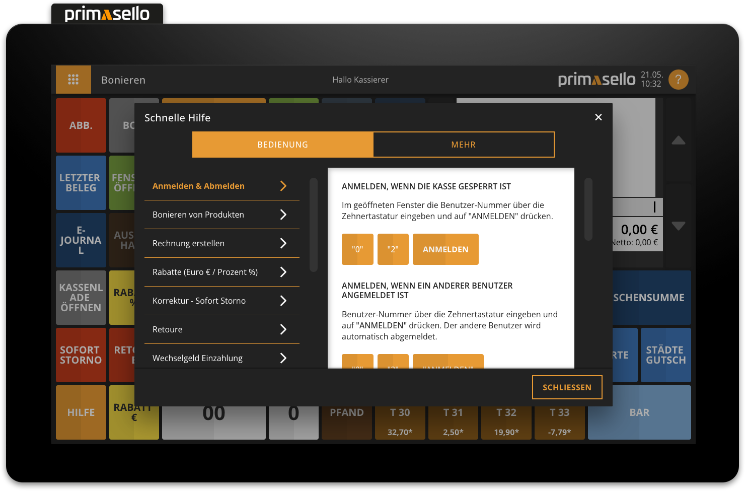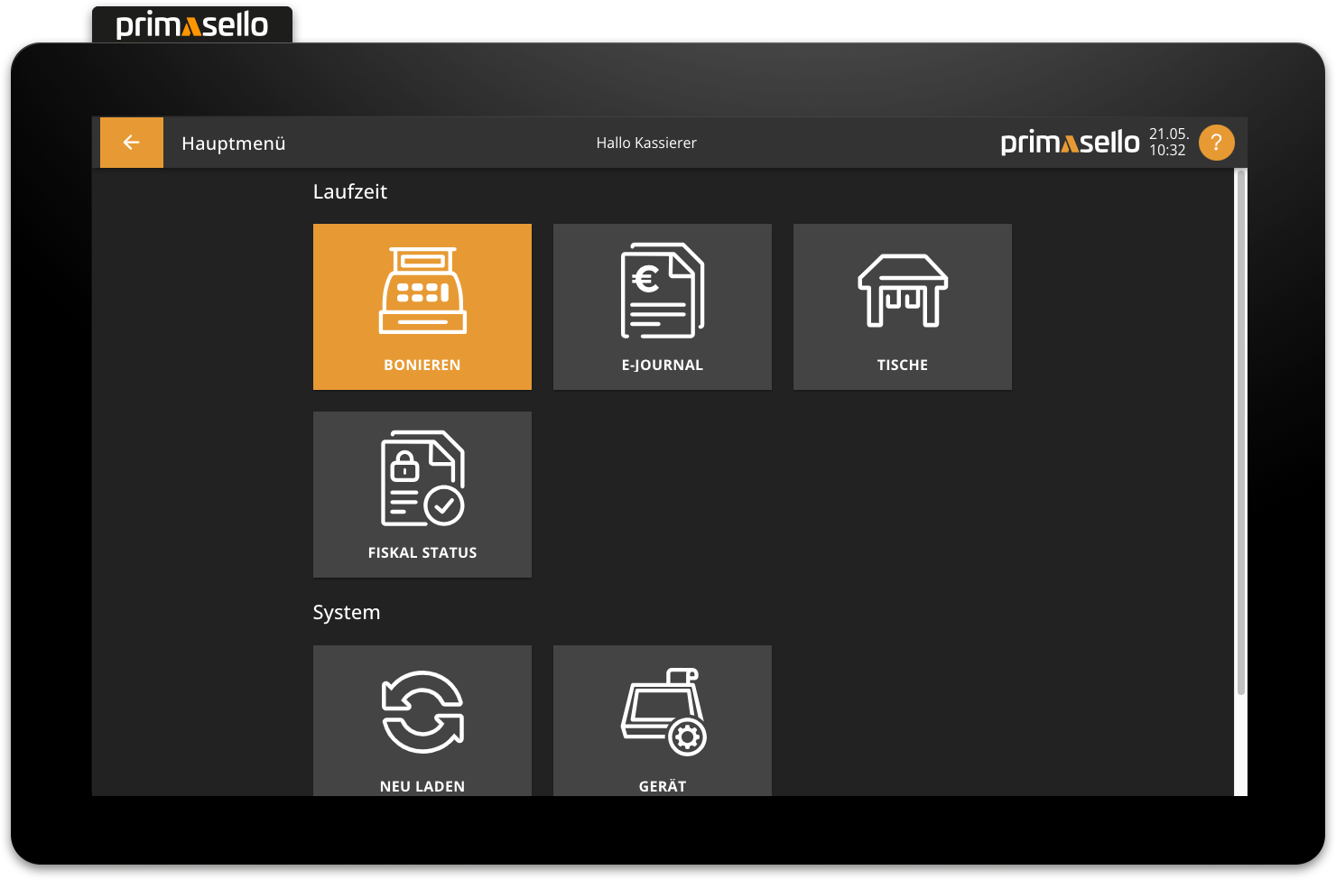 Durch Drücken der orangen "Bonieren"-Taste wird das Hauptmenü geschlossen und man gelangt wieder zur Bonieroberfläche.