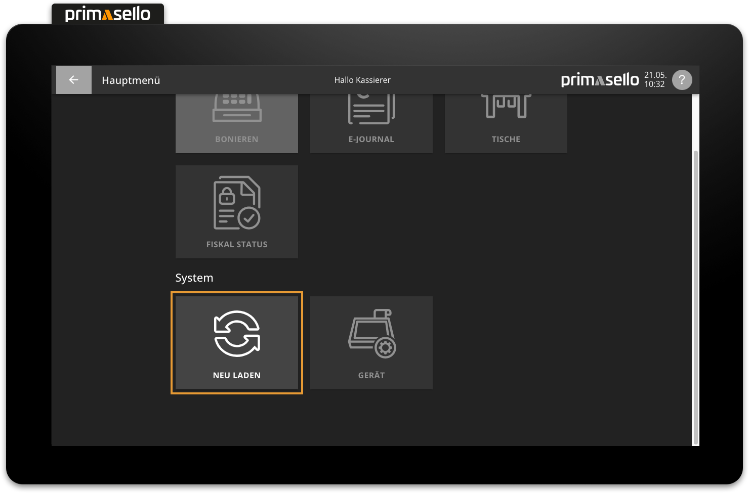 Durch Drücken der "Neu laden"-Taste wird die primasello Registrierkasse neu geladen. Dabei wird der aktuelle Benutzer abgemeldet.
