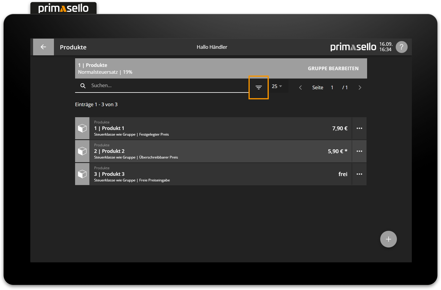 Die Suchleiste ist ein Eingabefeld, dass durch ein Lupensymbol gekennzeichnet wird. Durch die Eingabe von Text (z.B. Name des Produkts) oder Zahlen (z.B. Artikelnummer) werden die passenden Einträge in der Liste darunter angezeigt. Um die Suche zu beenden, muss entweder die Eingabe gelöscht werden, oder auf das "x"-Symbol am Ende der Suchleiste gedrückt werden.