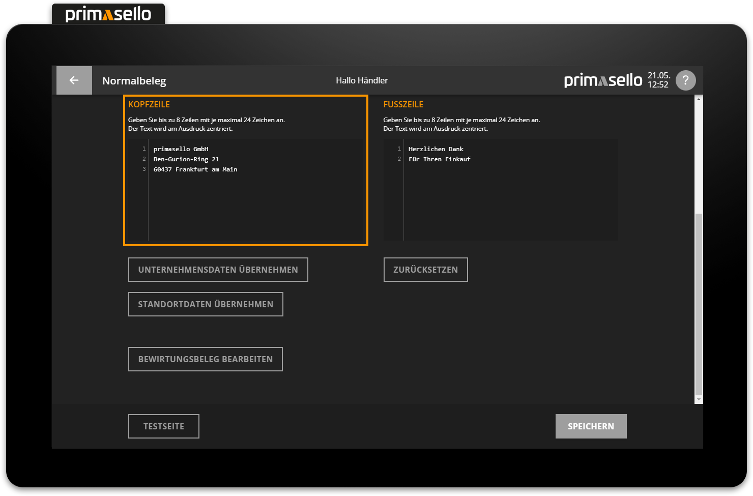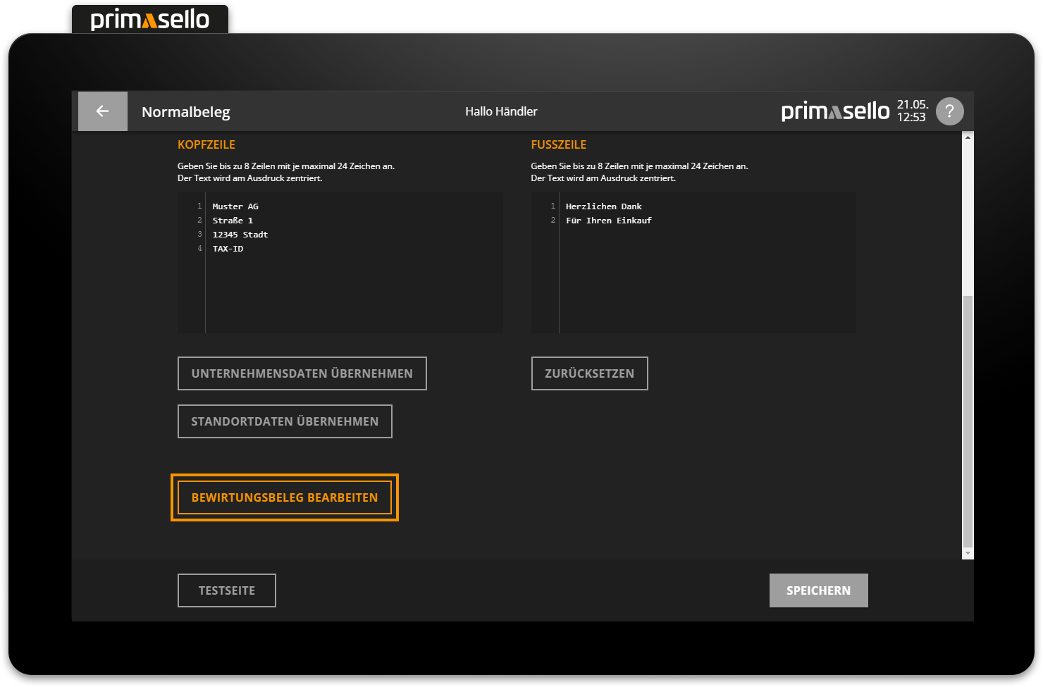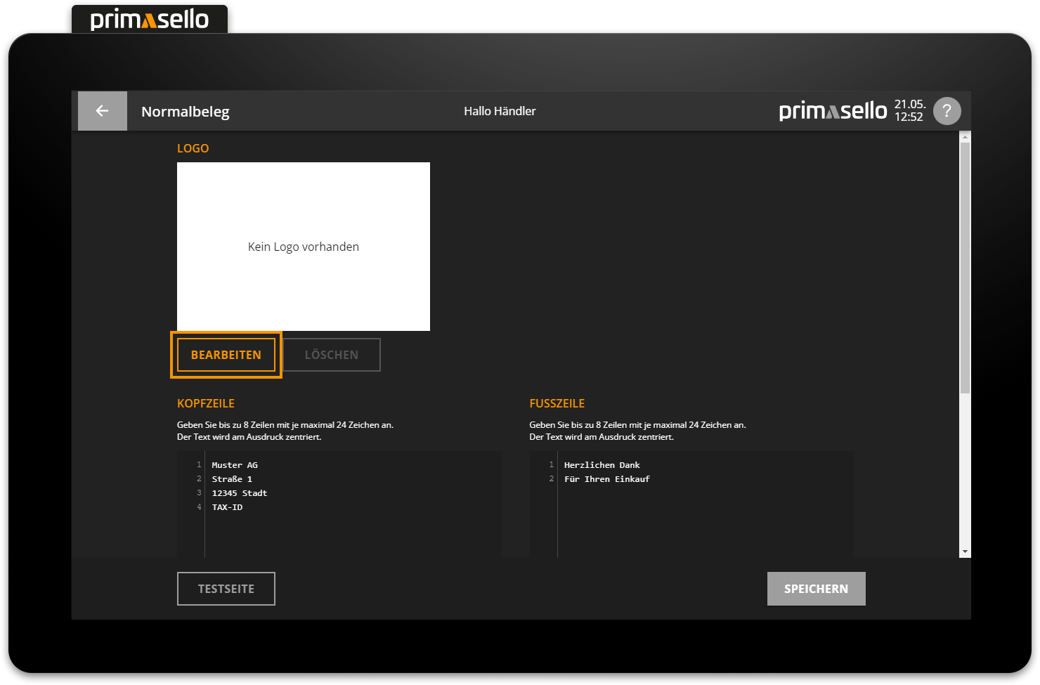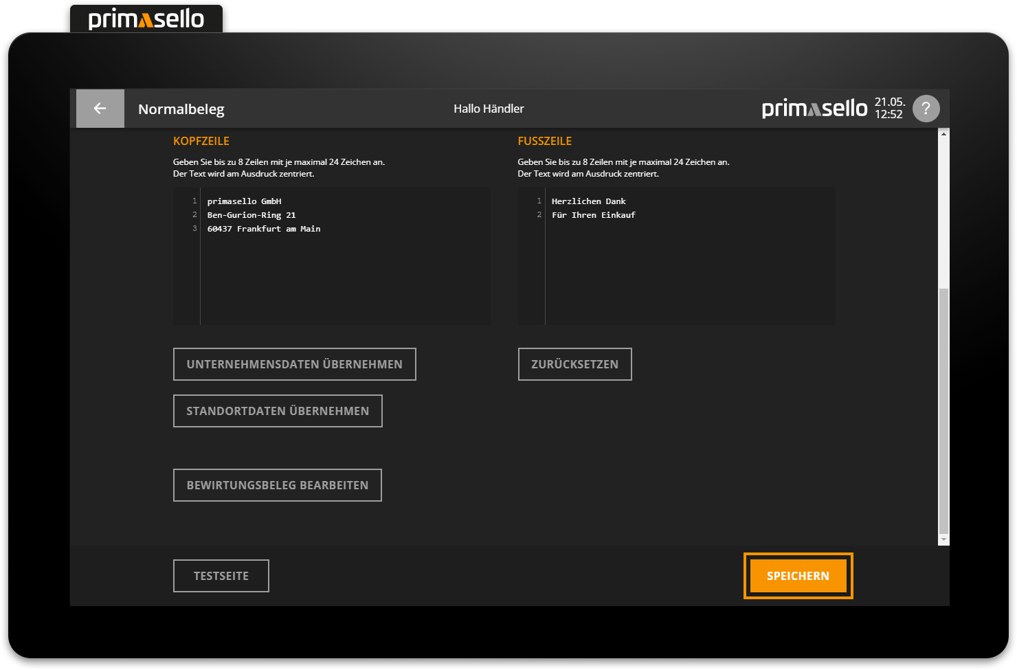 Um die Änderungen zu speichern, kann im rechten unteren Eck auf die orange "Speichern"-Taste gedrückt werden. Nach dem Speichern kann durch Drücken der "Testseite"-Taste ein Demo-Beleg gedruckt werden, um sich die geänderten Einstellungen anzusehen.