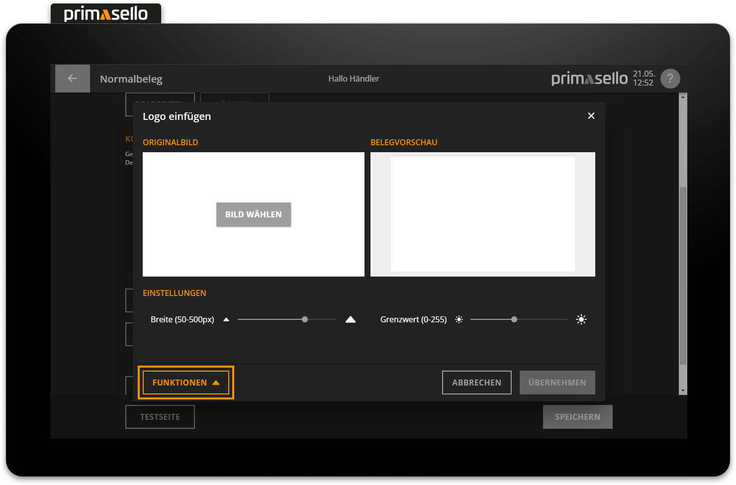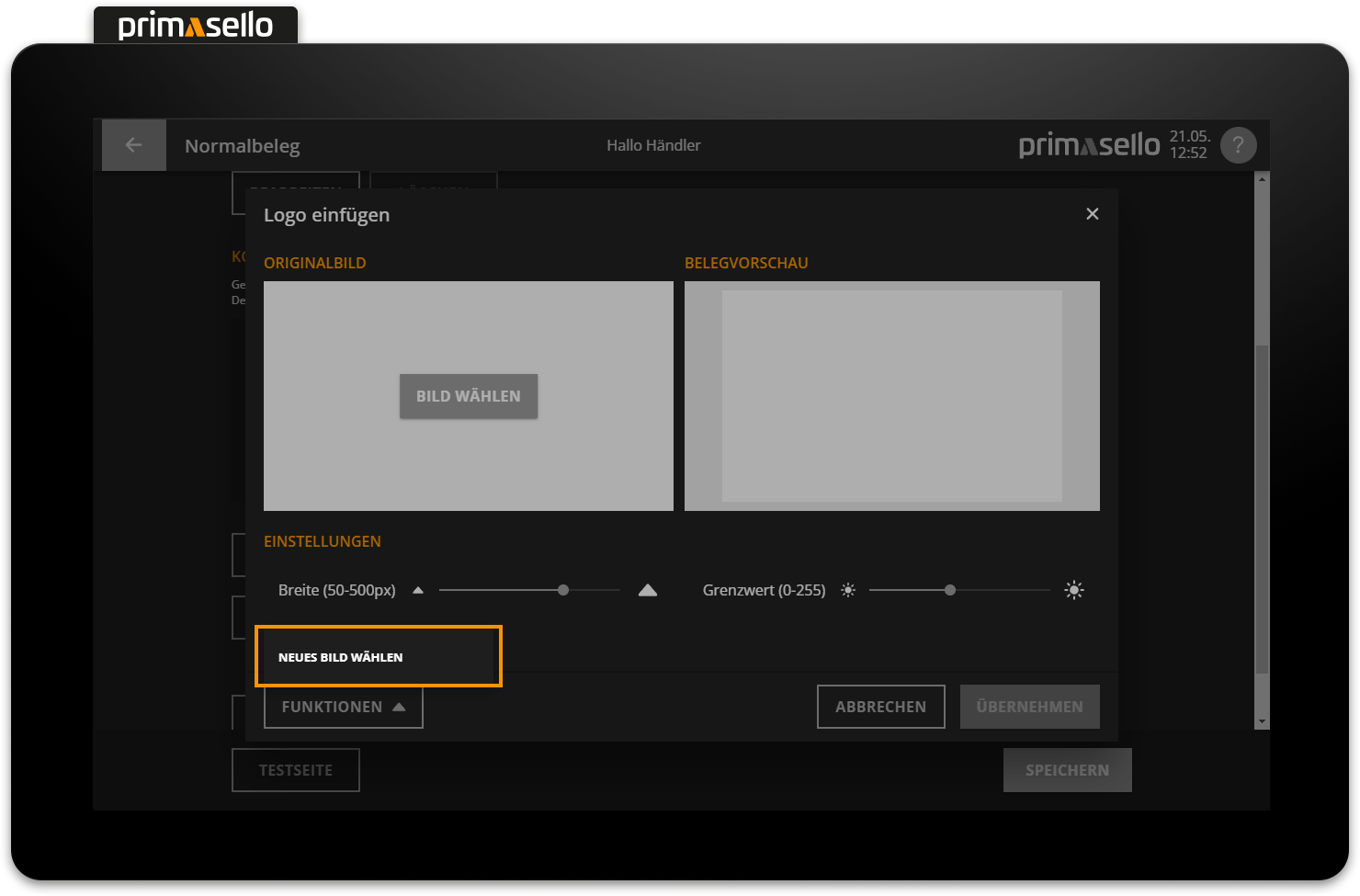 Um eine Logodatei hochzuladen, muss unter Funktionen "Neues Bild wählen" ausgewählt werden. Es kann ein Bild vom Speicher des Geräts oder einem angeschlossenen externen Speichermedium gewählt werden. Das hochgeladene Bild wird auf der linken Seite des Fensters unter der Überschrift Originalbild angezeigt. Jede Logodatei wird vom System in ein Schwarz-Weiß-Bild umgewandelt, das vom Bondrucker gedruckt werden kann. Rechts neben dem Originalbild, wird die Belegvorschau des Logos angezeigt.