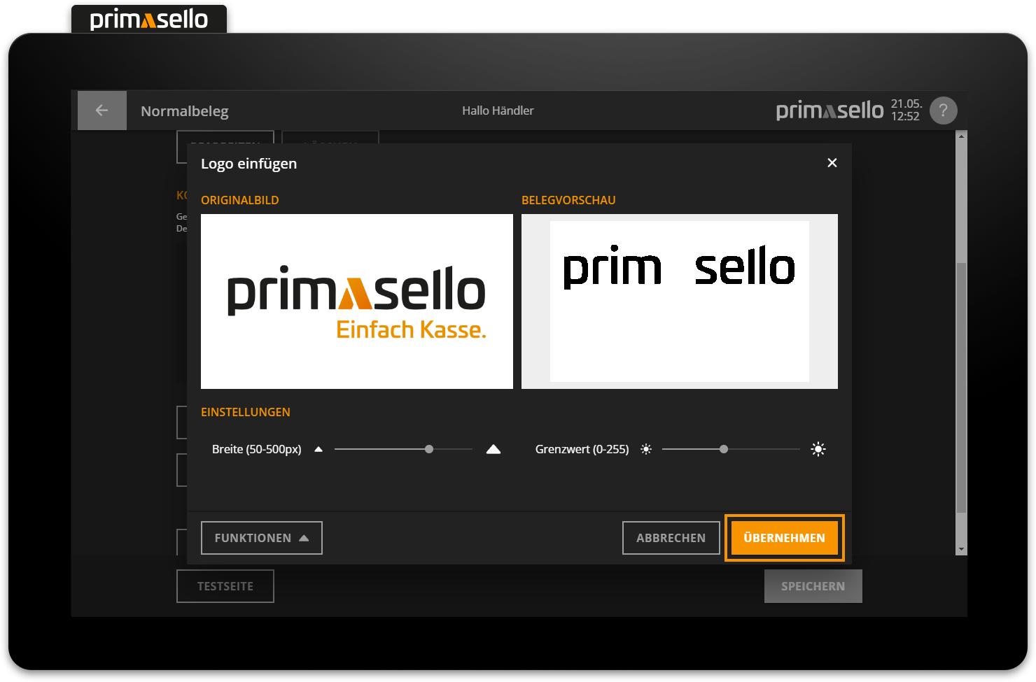 Unter den beiden Vergleichsbildern befinden sich zwei Schieberegler die durch Drücken und Ziehen eingestellt werden können. Die Breite bestimmt die Breite des Logos am Ausdruck, diese ist standardmäßig auf 360px voreingestellt. Der zweite Regler bestimmt den Grenzwert für die Farbumwandlung des Logos. Da der Thermodrucker des Geräts nur Schwarz oder Weiß und keine Grautöne drucken kann, müssen die farbigen Anteile der Logodatei entweder in Schwarz oder Weiß umgewandelt werden. Durch Verschieben des Grenzwert-Reglers kann die Umwandlung angepasst werden. Wird der Regler nach links geschoben werden mehr Anteile des Logos weiß, wird der Regler nach rechts geschoben werden mehr Anteile Schwarz. Standardmäßig ist der Grenzwert auf 200 eingestellt, was bereits sehr viele hellere Farben in Schwarz umwandelt.