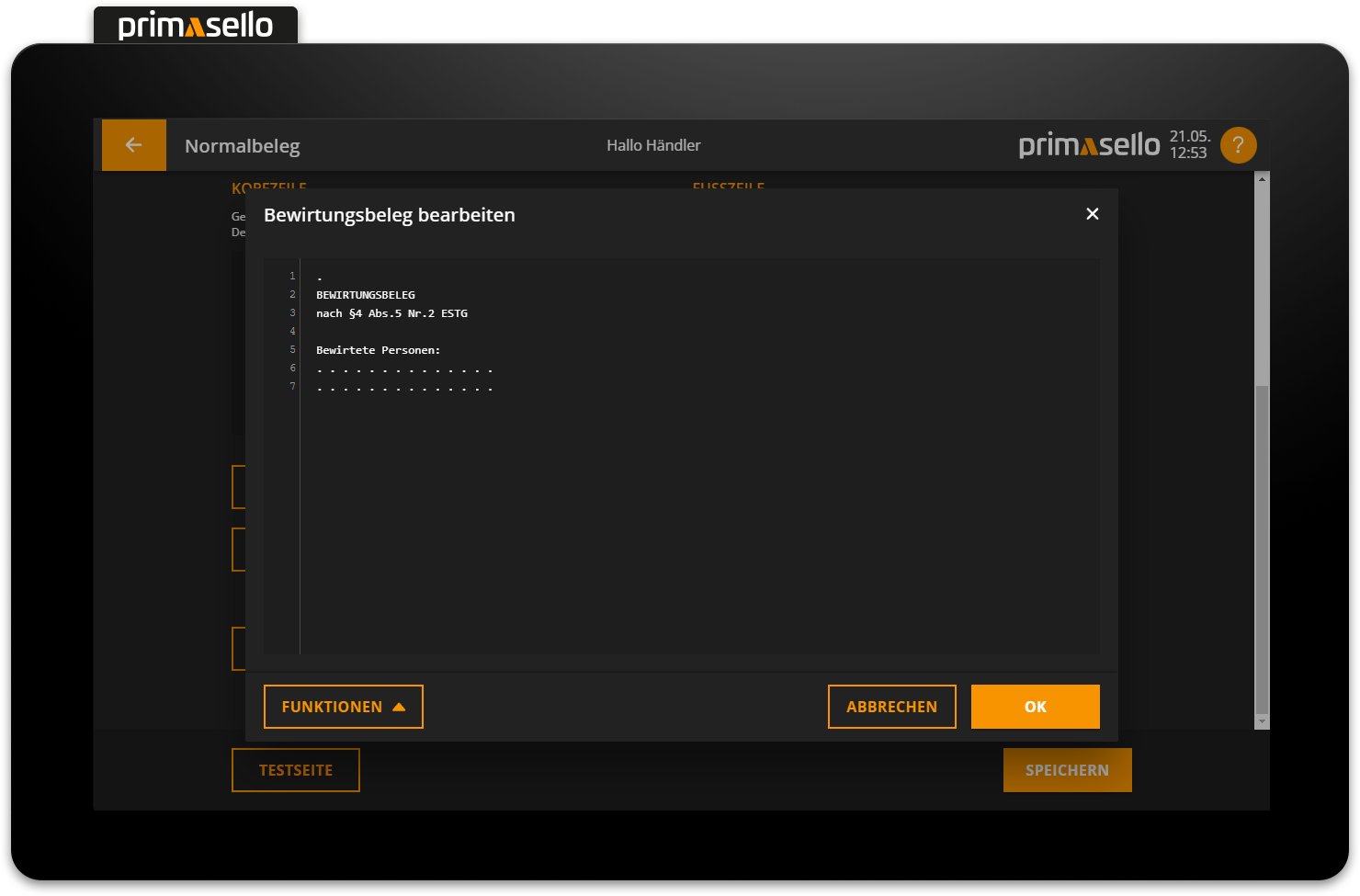 In diesem Kapitel wird die Bearbeitung der Belegvorlage beschrieben. In der Belegvorlage wird die Gestaltung jedes Ausdrucks definiert, die bei allen Druckvorgängen verwendet wird. Am Beleg kann das Logo (Bilddatei), die Kopfzeilen (max. 8 Zeilen), die Fußzeilen (max. 8 Zeilen) und der Bewirtungsbeleg bearbeitet werden.