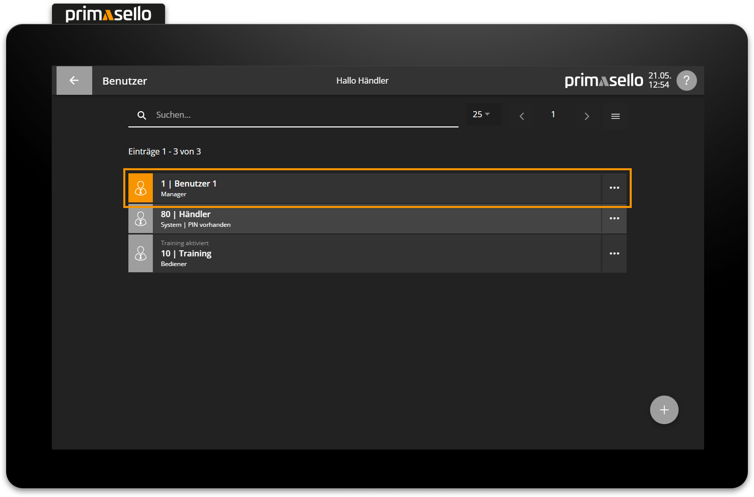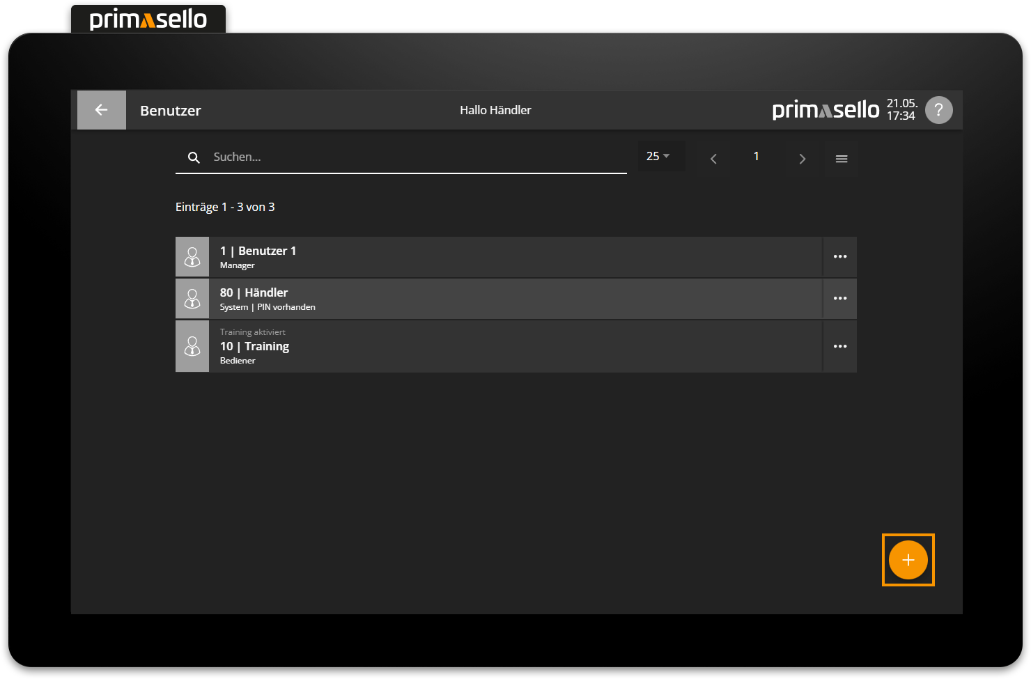 In der Listenansicht der Benutzer, kann auf die orange "Plus"-Taste am rechten unteren Bildschirmrand gedrückt werden, um einen neuen Benutzer zu erstellen.