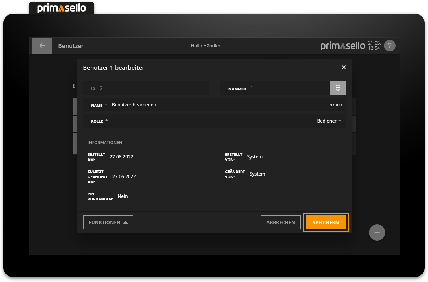 Durch Drücken der orangen "Speichern"-Taste im rechten unteren Eck, werden die Änderungen am Benutzer übernommen und das Fenster geschlossen. Das Bearbeiten eines Benutzers kann durch Drücken der "Abbrechen"-Taste oder durch Drücken der "x"-Taste im rechten oberen Eck beendet werden - alle Änderungen gehen dabei verloren.