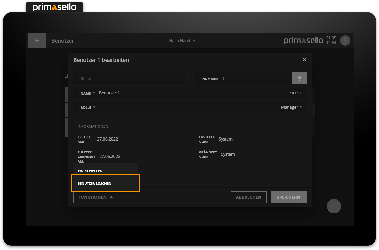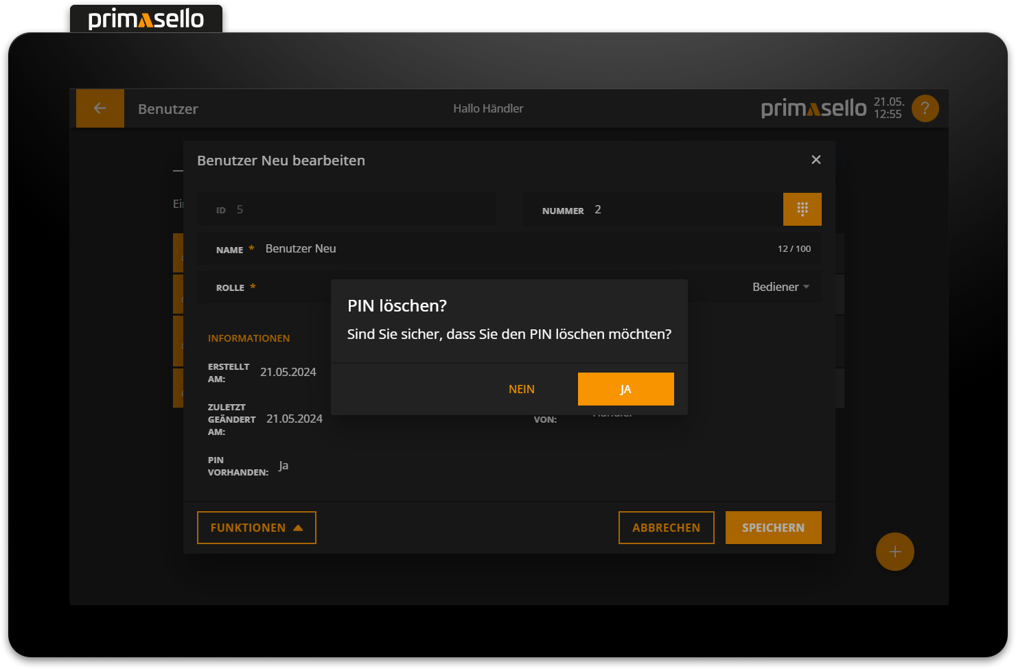 Um den PIN eines Benutzers zu löschen, kann dieser durch Drücken des entsprechenden Eintrags der Liste gewählt werden. Es öffnet sich ein Fenster mit den Details zum Benutzer. Im linken unteren Eck befindet sich die "Funktionen"-Taste. Wird diese gedrückt öffnet sich ein Untermenü. Darin befindet sich die "PIN löschen"-Taste. Wird diese gedrückt, erscheint eine Sicherheitsabfrage, die mit der "Ja"-Taste bestätigt werden kann. Der PIN wird entfernt und der Benutzer kann sich ab jetzt ohne PIN in der primasello Registrierkasse anmelden. Das Löschen des PINs kann durch Drücken der "Nein"-Taste in der Sicherheitsabfrage abgebrochen werden.