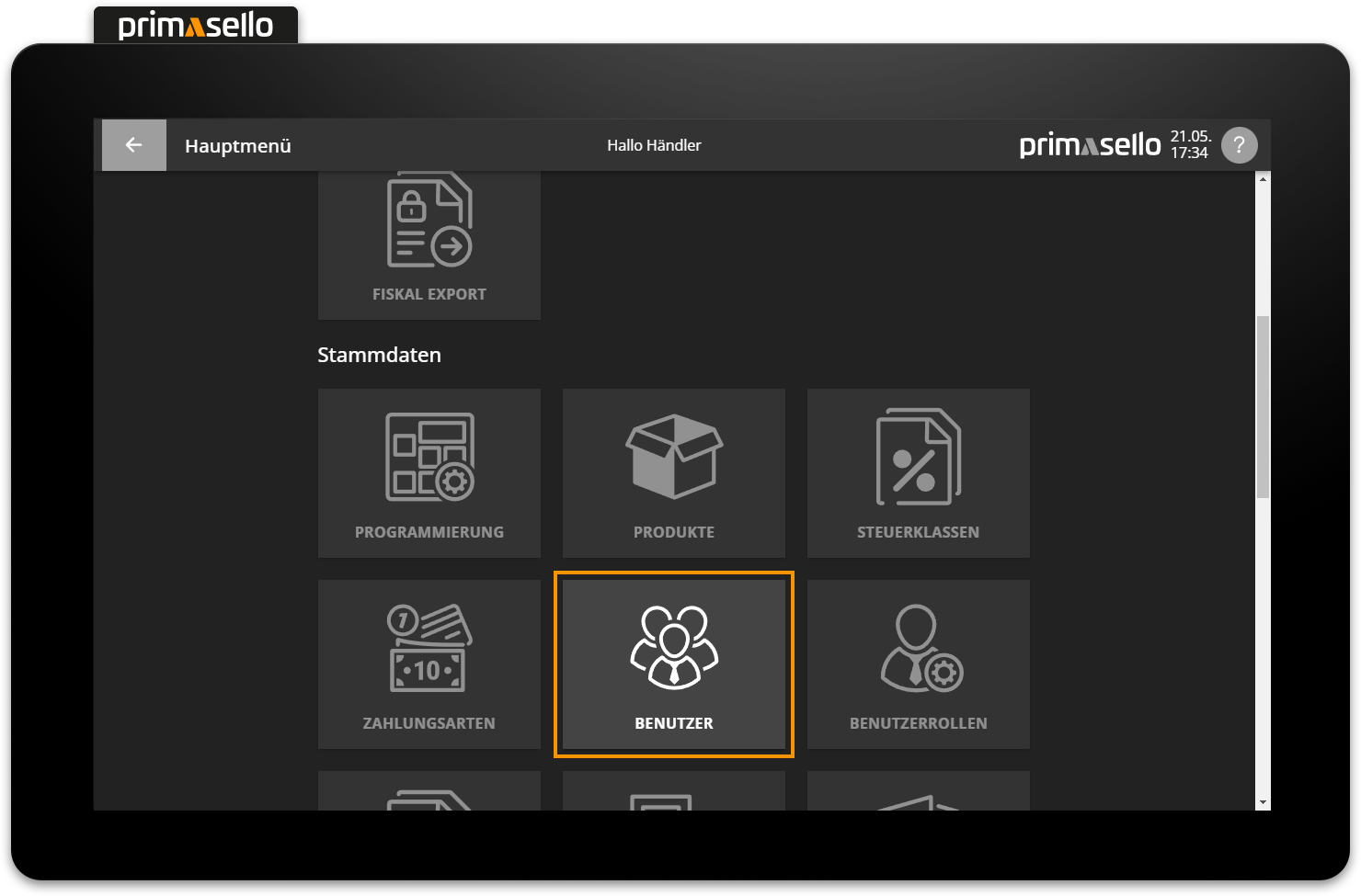 In diesem Kapitel wird die Erstellung von neuen und die Bearbeitung von bestehenden Benutzern beschrieben. Die Benutzer können im Hauptmenü im Abschnitt "Stammdaten" über die "Benutzer"-Taste aufgerufen werden.