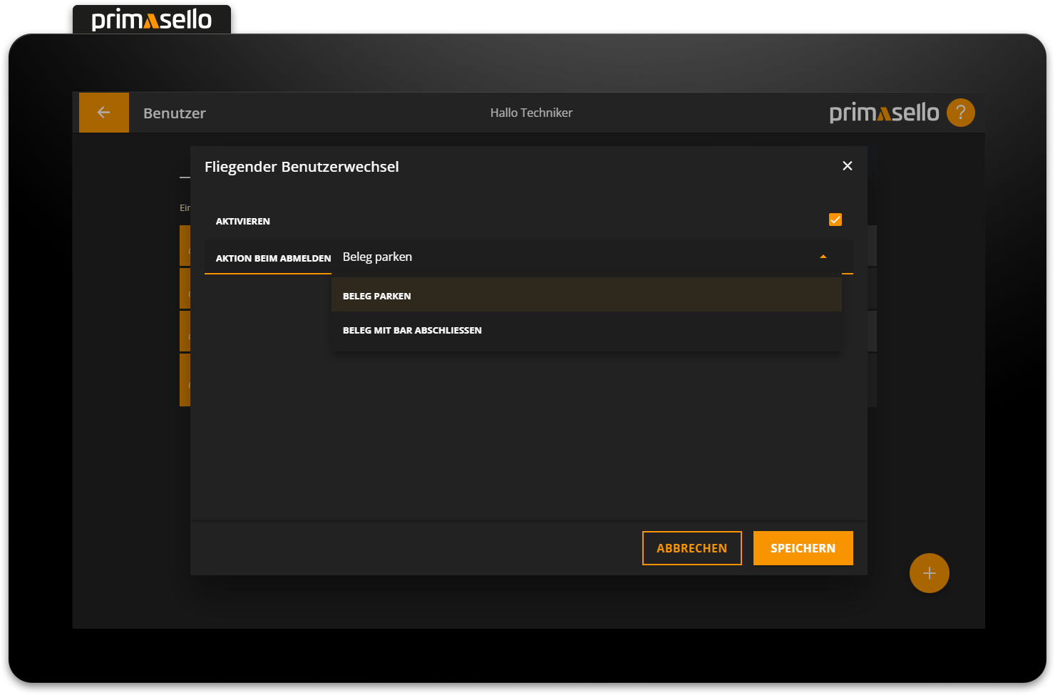 Zusätzlich kann ausgewählt werden, ob beim Abmelden eines Benutzers die Positionen auf diesen geparkt werden, oder der offene Beleg automatisch als Barrechnung abgeschlossen wird. Durch Drücken der orangen "Speichern"-Taste im rechten unteren Eck, werden die Einstellungen gespeichert.