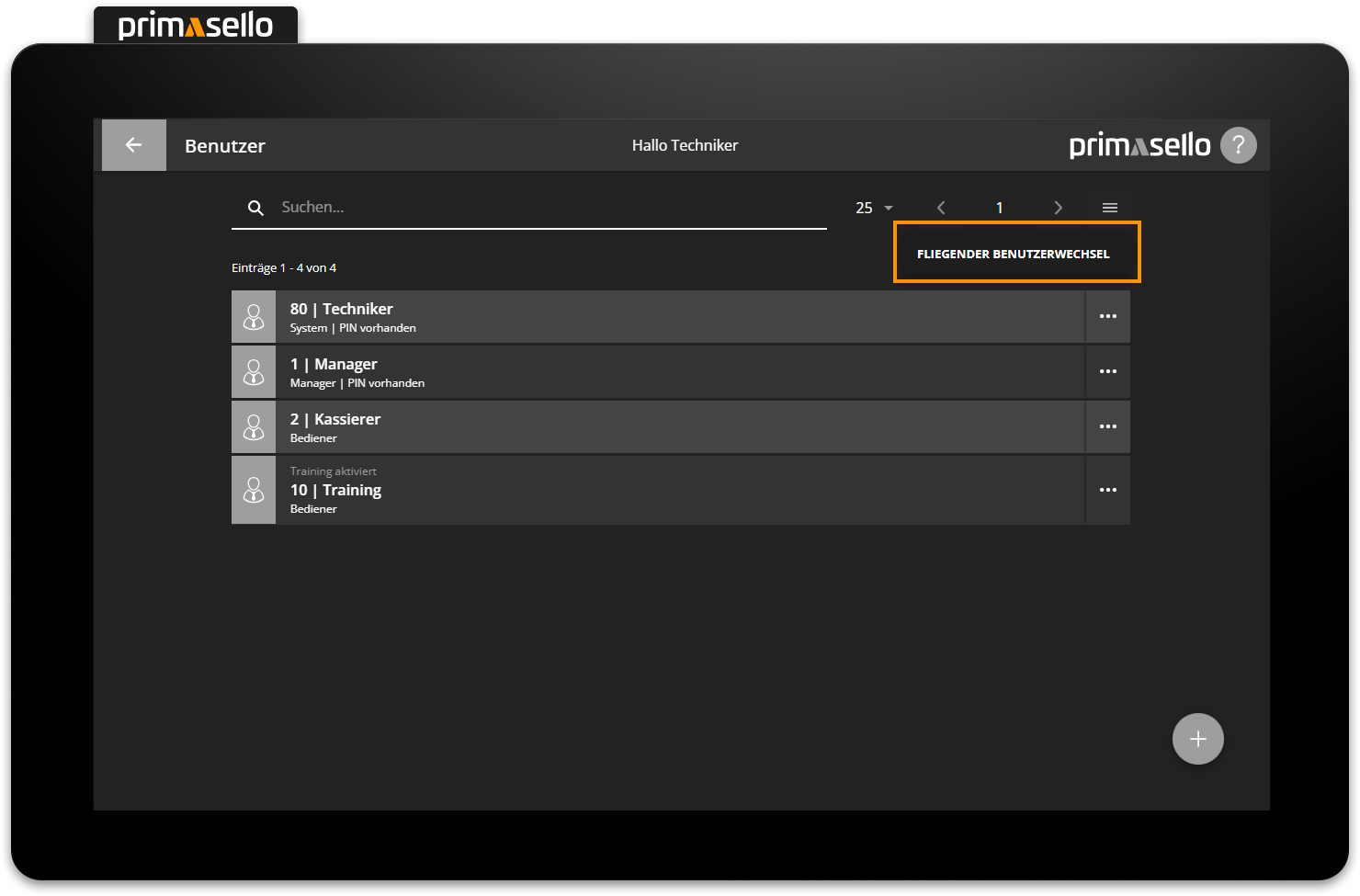 Um das Parken von Positionen nicht nur auf Tische, sondern auch auf Benutzer zu ermöglichen kann der Fliegende Benutzerwechsel aktiviert werden. In der Listenansicht der Benutzer kann im rechten oberen Eck auf das Symbol mit den drei Strichen gedrückt werden.