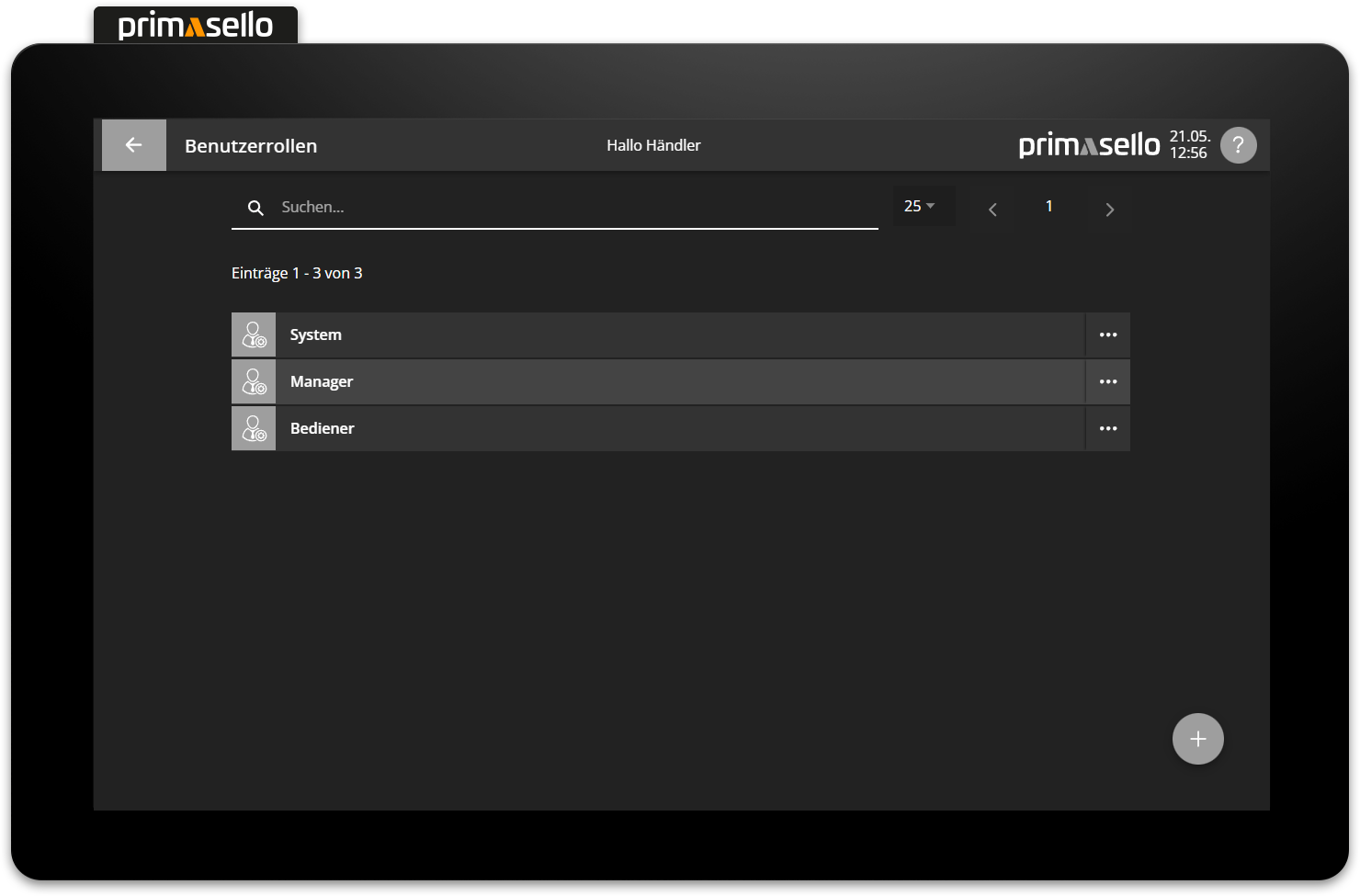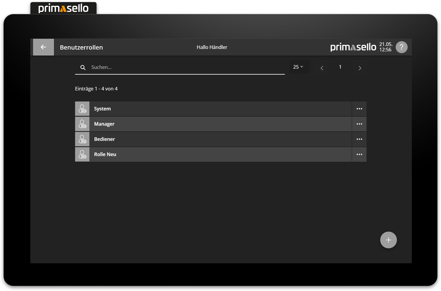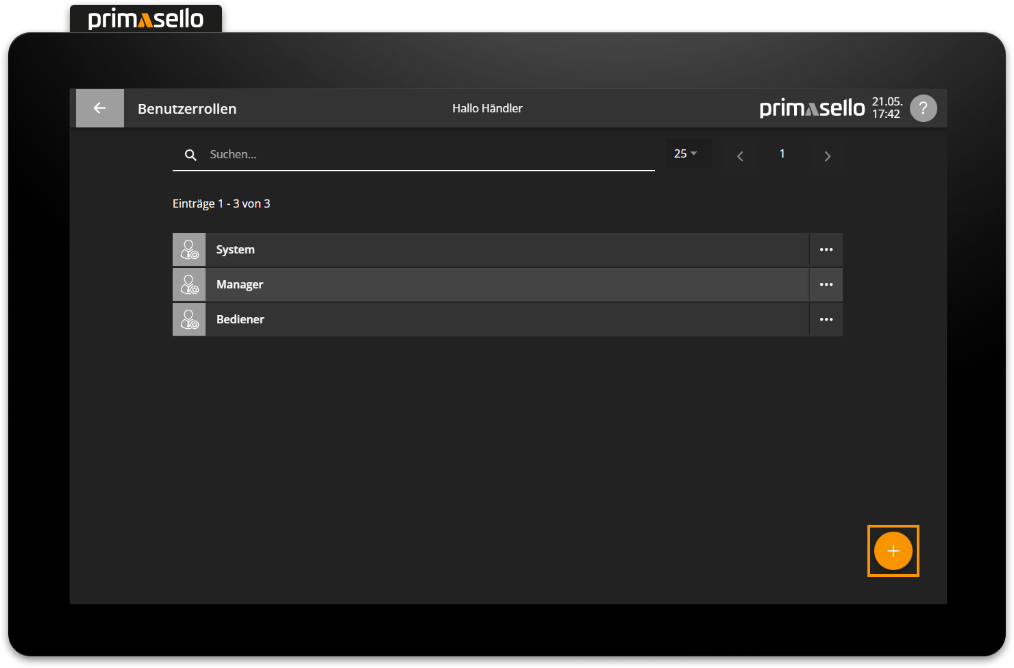 In der Listenansicht der Benutzerrollen, muss auf die orange "Plus"-Taste am rechten unteren Bildschirmrand gedrückt werden, um eine neue Benutzerrolle zu erstellen.