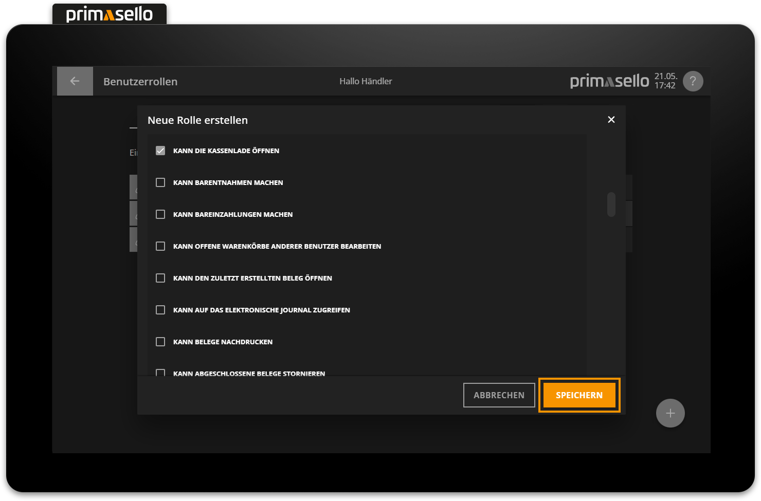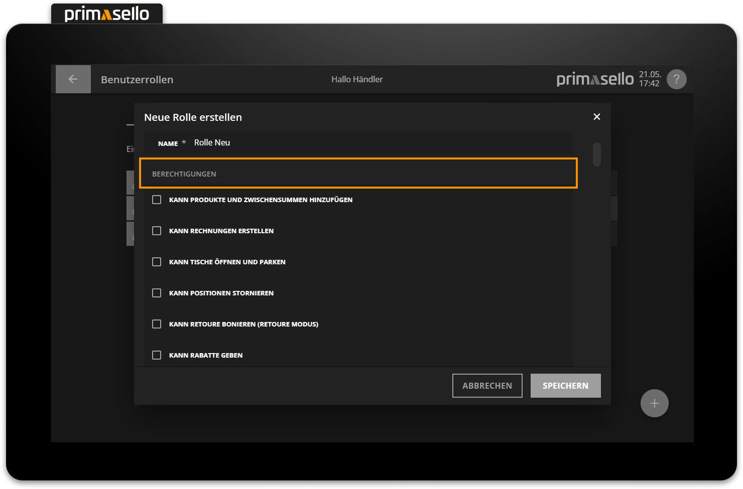 Durch Drücken der orangen "Speichern"-Taste im rechten unteren Eck, wird die neue Benutzerrolle erstellt und das Fenster geschlossen. Das Erstellen einer neuen Benutzerrolle kann durch Drücken der "Abbrechen"-Taste oder durch Drücken der "x"-Taste im rechten oberen Eck beendet werden - alle Einstellungen gehen dabei verloren.