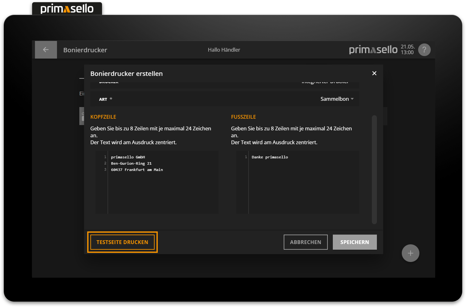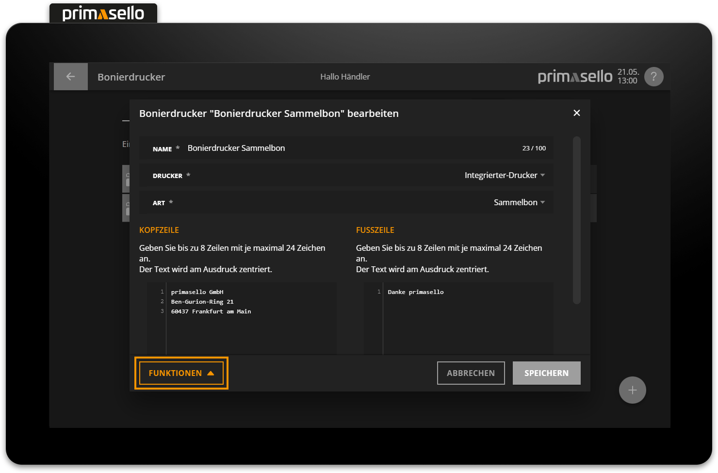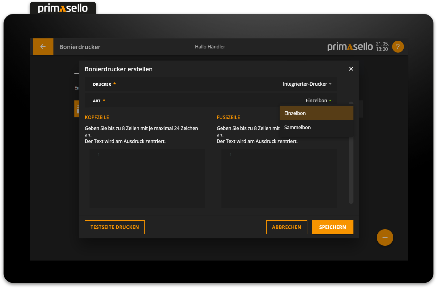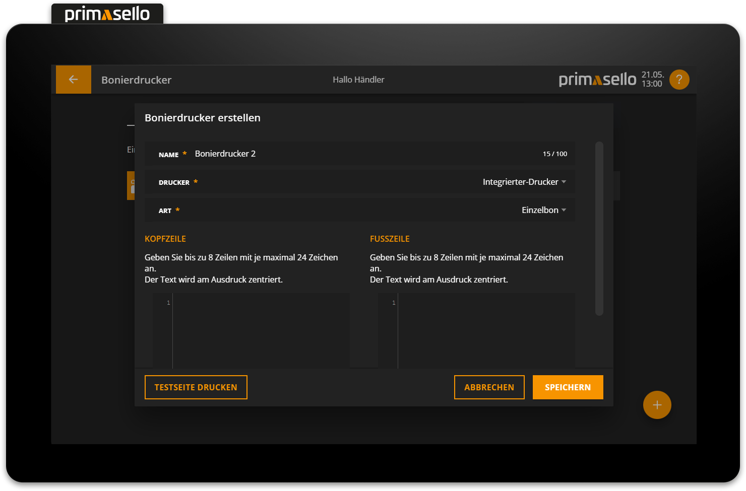 Durch Drücken der orangen "Speichern"-Taste im rechten unteren Eck, werden die Änderungen am Bonierdrucker übernommen und das Fenster geschlossen. Das Bearbeiten eines Bonierdruckers kann durch Drücken der "Abbrechen"-Taste oder durch Drücken der "x"-Taste im rechten oberen Eck beendet werden - alle Änderungen gehen dabei verloren.
