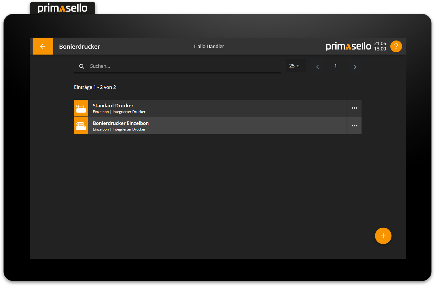 In der Listenansicht der Bonierdrucker, kann auf die orange "Plus"-Taste am rechten unteren Bildschirmrand gedrückt werden, um einen neuen Bonierdrucker zu erstellen.