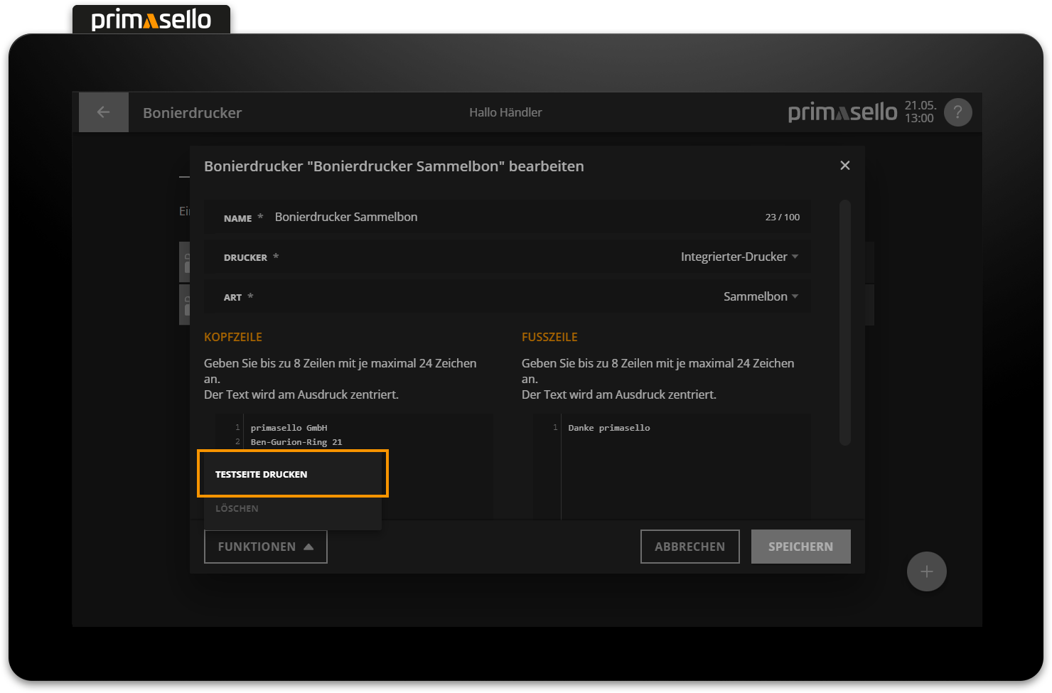 Bei bestehenden Bonierdruckern befindet sich die "Testseite drucken"-Taste im Untermenü der "Funktionen"-Taste im linken unteren Eck.