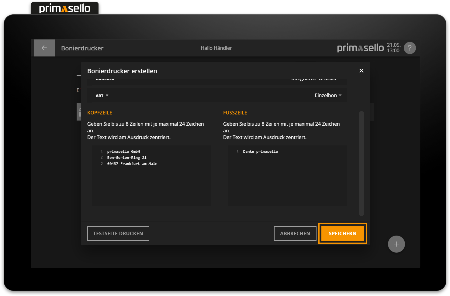 Durch Drücken der orangen "Speichern"-Taste im rechten unteren Eck, wird der neue Bonierdrucker erstellt und das Fenster geschlossen. Das Erstellen eines neuen Bonierdruckers kann durch Drücken der "Abbrechen"-Taste oder durch Drücken der "x"-Taste im rechten oberen Eck beendet werden - alle Einstellungen gehen dabei verloren.