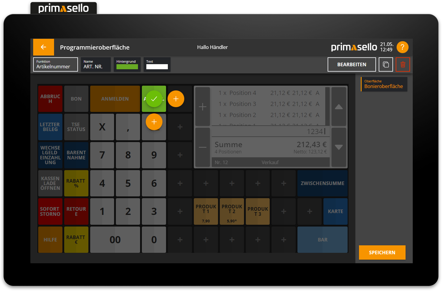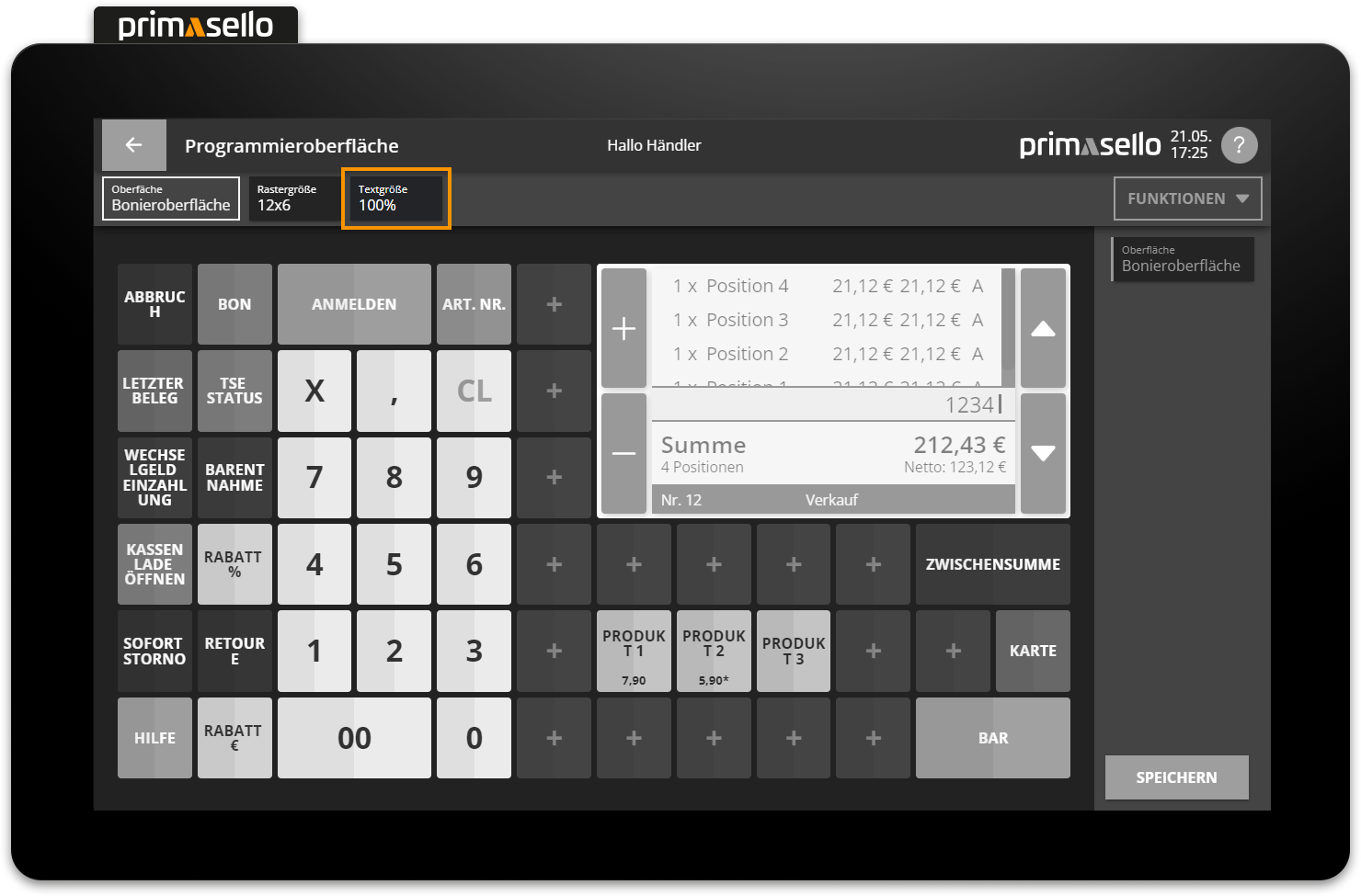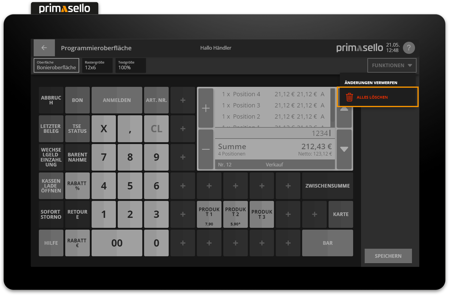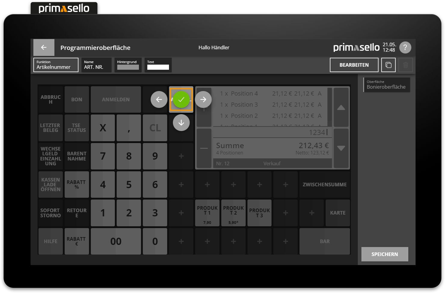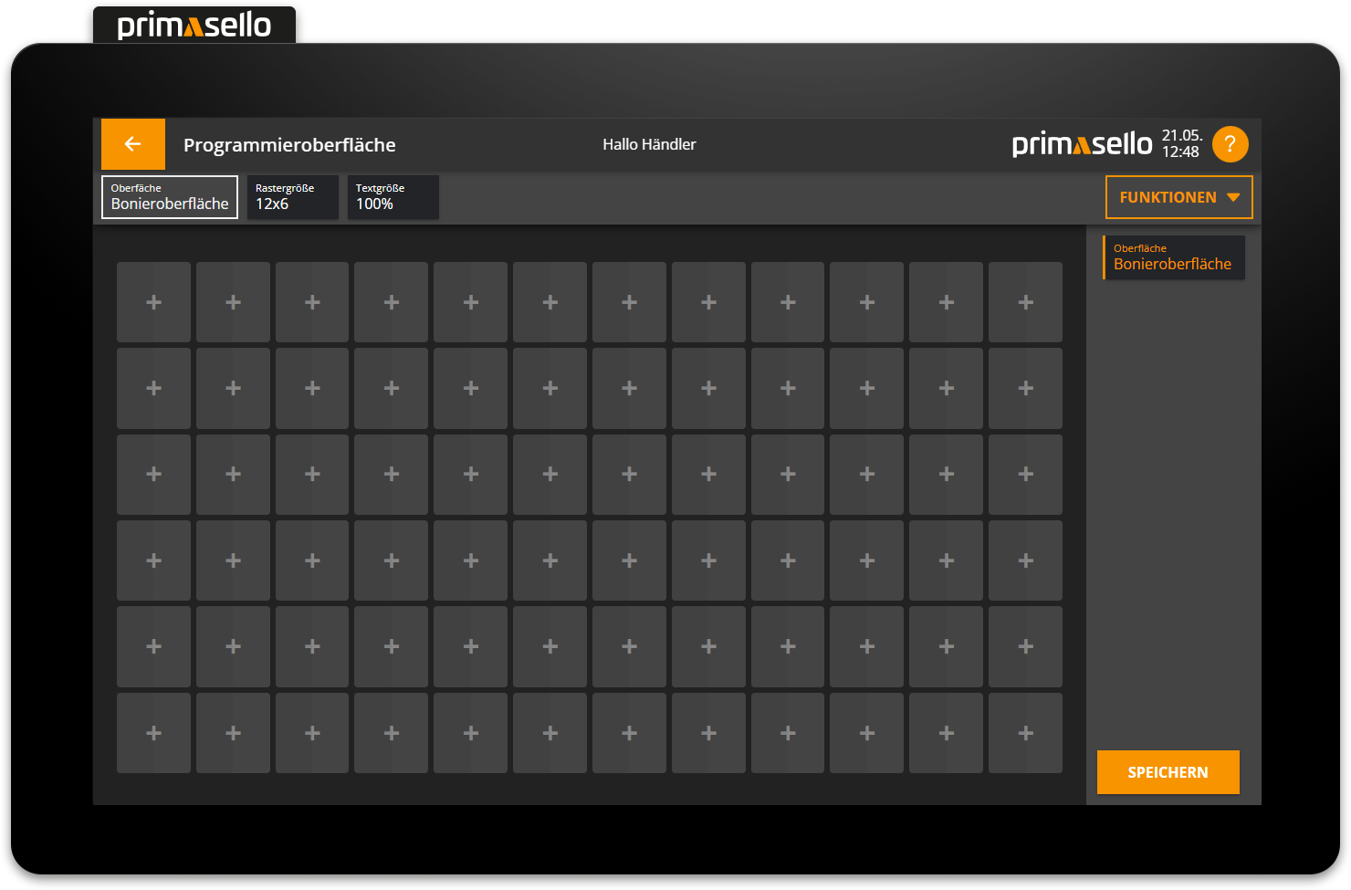 In diesem Kapitel wird die Programmierung der Bonieroberfläche beschrieben. Durch die individuelle Gestaltung der Bonieroberfläche, kann die primasello Registrierkasse perfekt auf die Bedürfnisse jeder Branche und jedes Unternehmens angepasst werden. Die Bearbeitung kann im Hauptmenü im Abschnitt "Stammdaten" über die "Programmierung"-Taste gestartet werden.