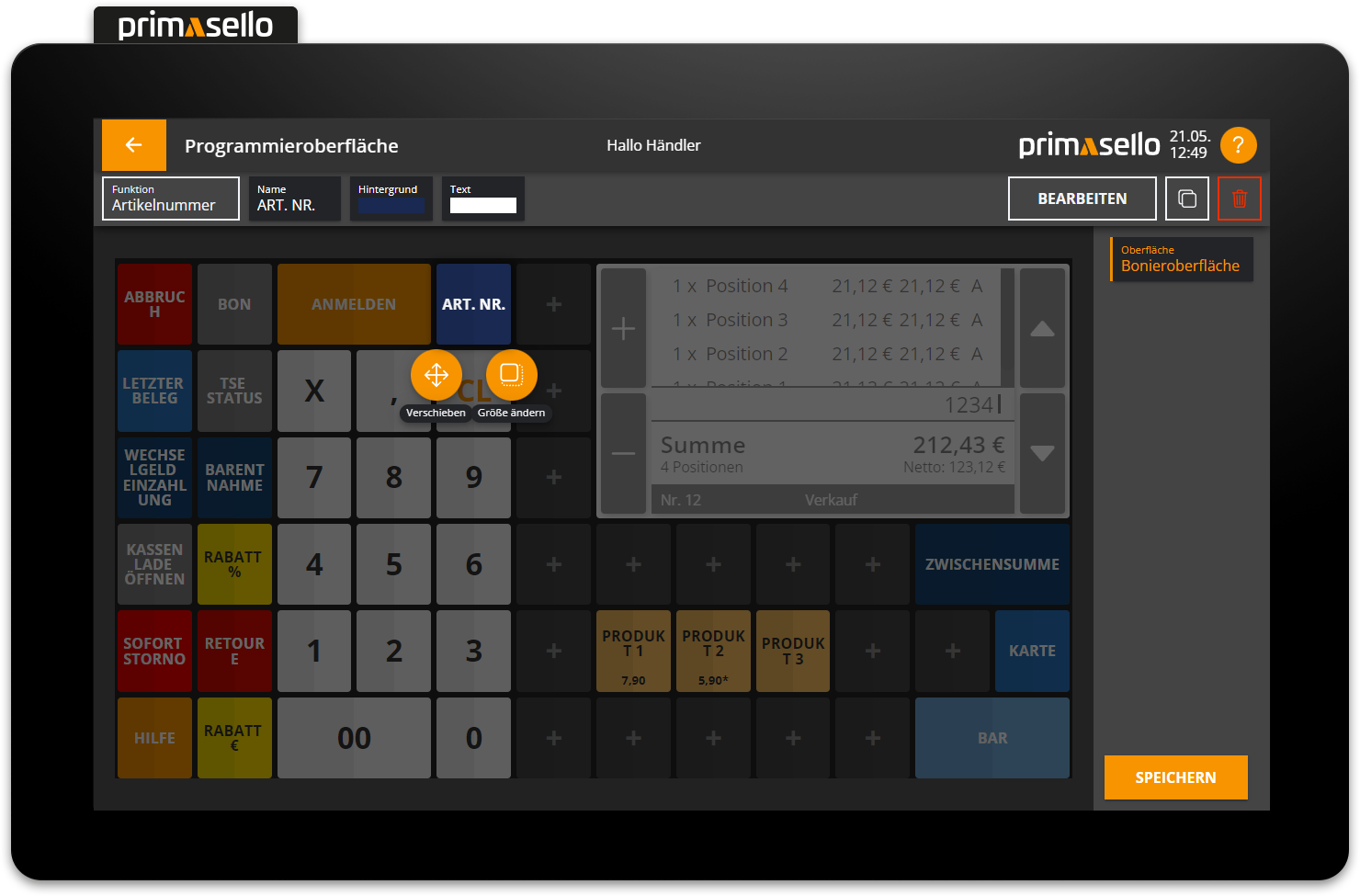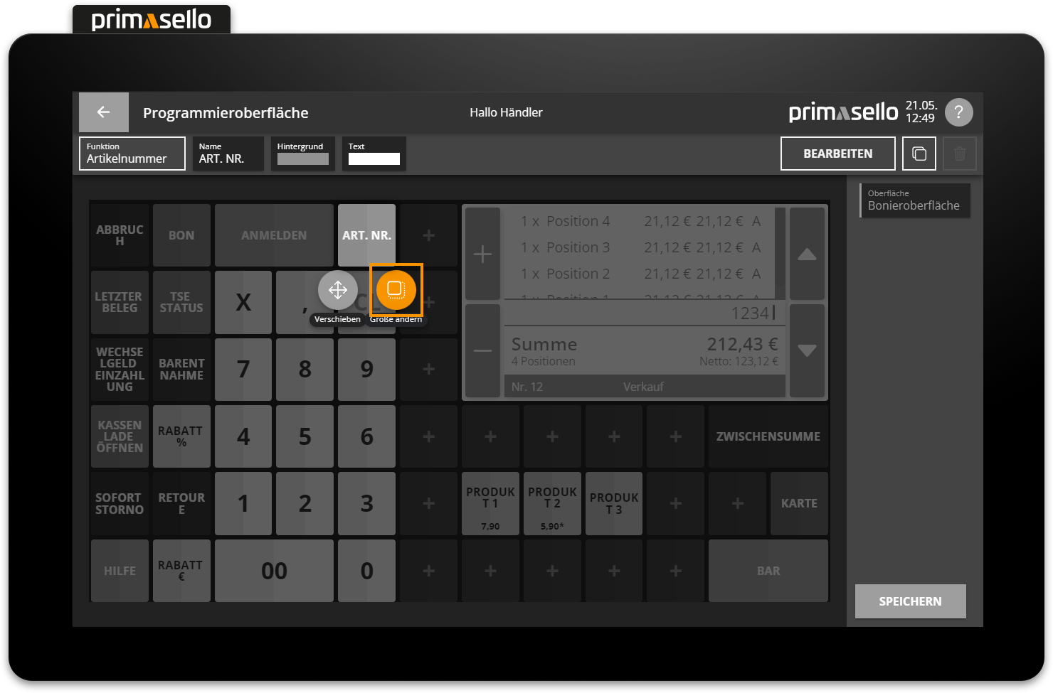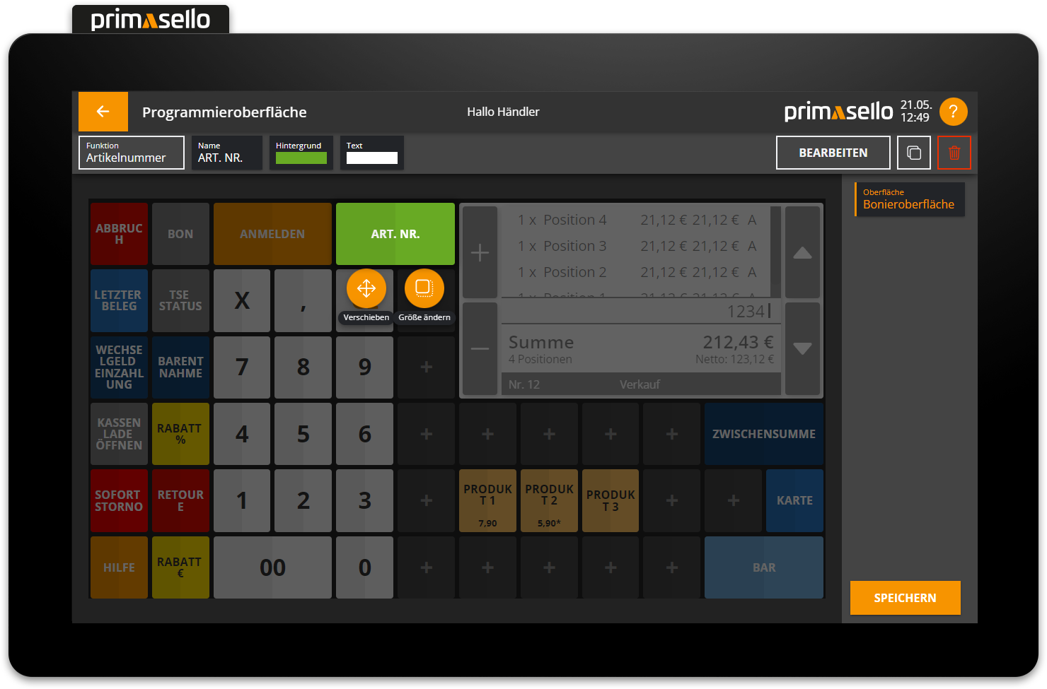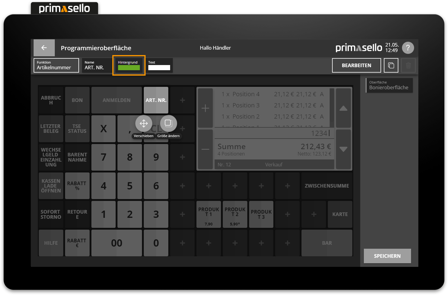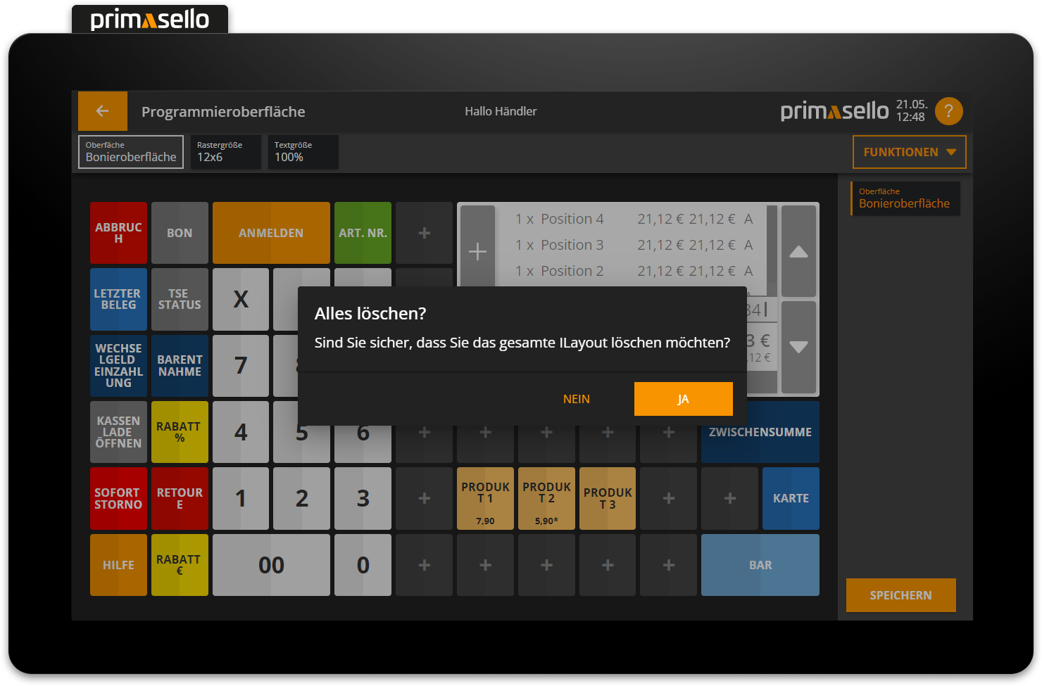 In diesem Kapitel wird die Programmierung der Bonieroberfläche beschrieben. Durch die individuelle Gestaltung der Bonieroberfläche, kann die primasello Registrierkasse perfekt auf die Bedürfnisse jeder Branche und jedes Unternehmens angepasst werden. Die Bearbeitung kann im Hauptmenü im Abschnitt "Stammdaten" über die "Programmierung"-Taste gestartet werden.