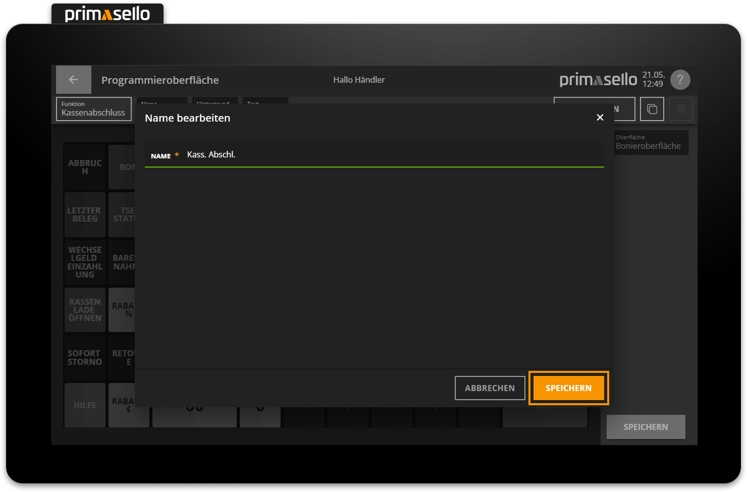 Durch Drücken der orangen "Speichern"-Taste im rechten unteren Eck, wird der Name übernommen und das Fenster geschlossen. Das Ändern des Namens kann durch Drücken der "Abbrechen"-Taste oder durch Drücken der "x"-Taste im rechten oberen Eck beendet werden - alle Änderungen gehen dabei verloren.