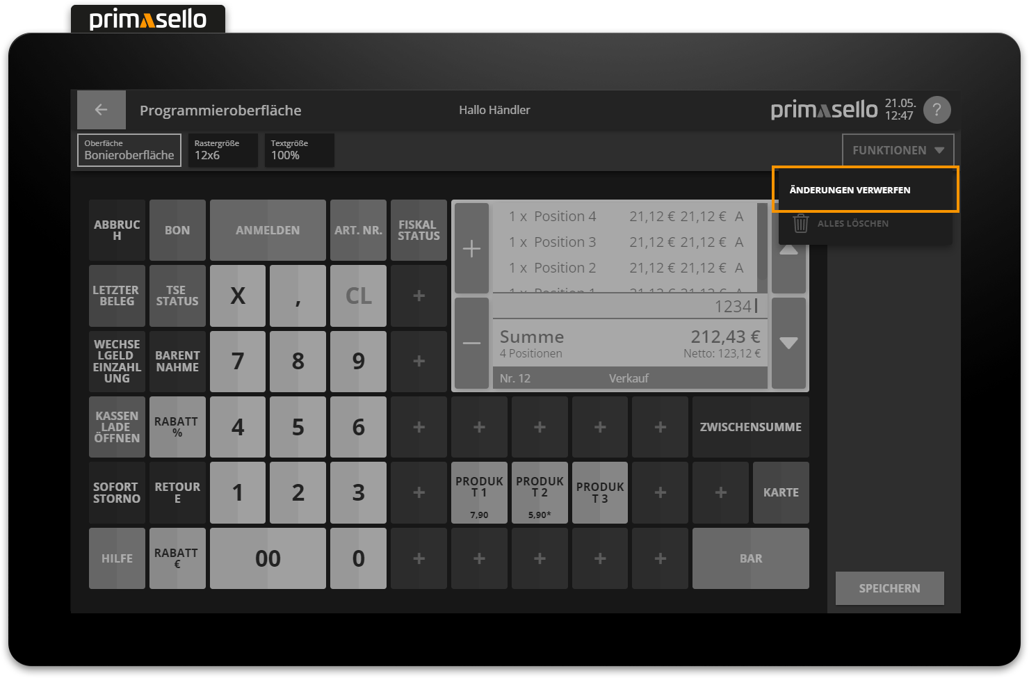 Die Bearbeitung der Oberfläche ist erst sinnvoll, wenn alle benötigten Stammdaten erstellt und Einstellungen getroffen wurden. Sind nicht alle Produkte oder Zahlungsarten angelegt, kann es mühsam werden, zwischen den Konfigurationen hin und her zu wechseln.