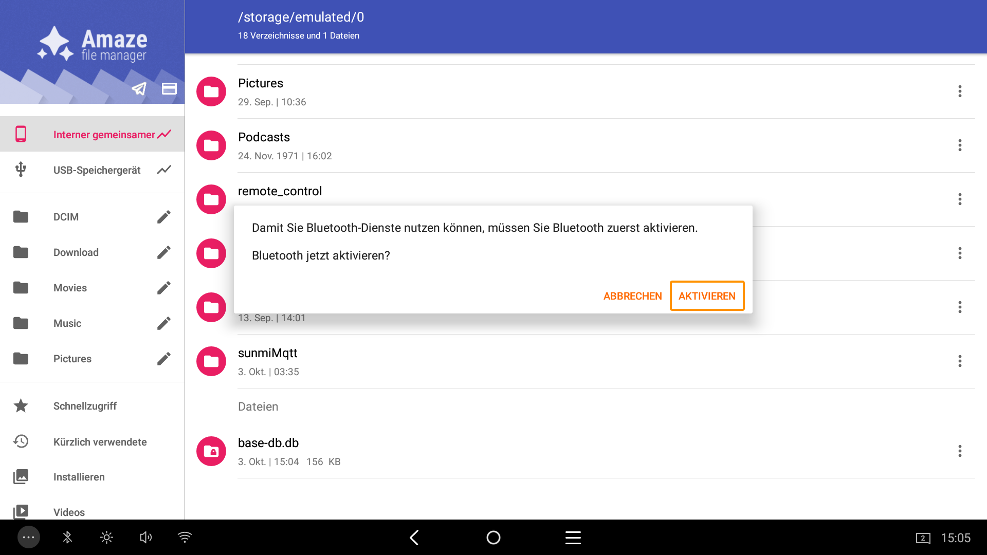 Soll eine Datei, z.B. eine Datenbank-Sicherung von einem USB-Stick geladen werden, erscheint beim ausführen der Funktion am unteren Rand des Bildschirms ein Fenster mit der Auswahl der verfügbaren Speichermedien. Hier sollte die Auswahl "Amaze" gewählt werden, um die Daten des angeschlossenen USB-Sticks aufzurufen.
