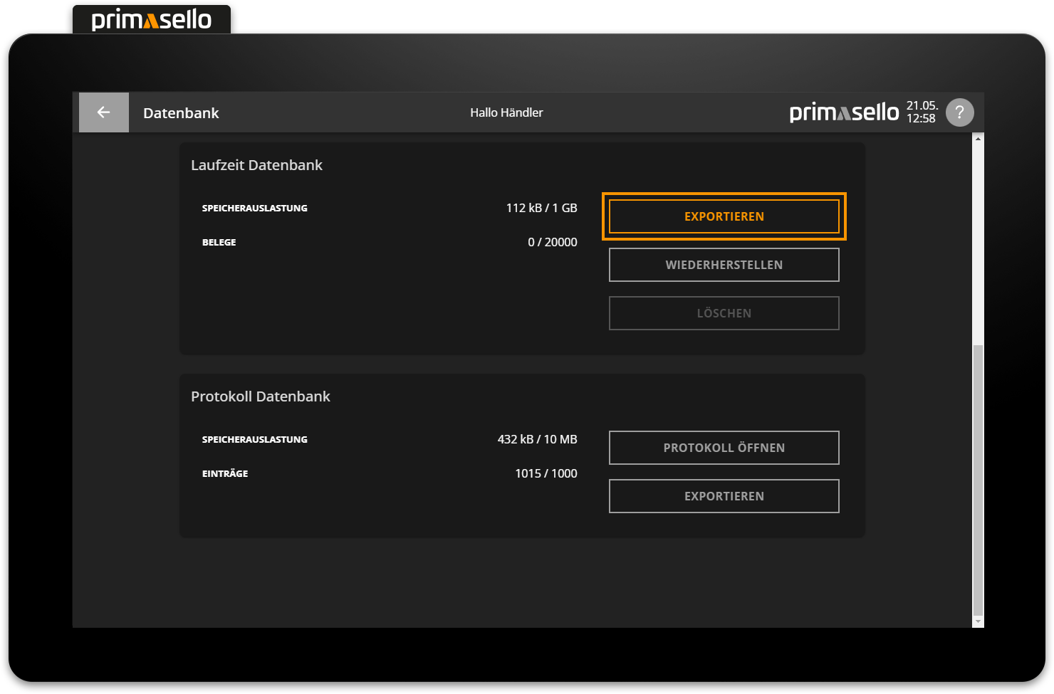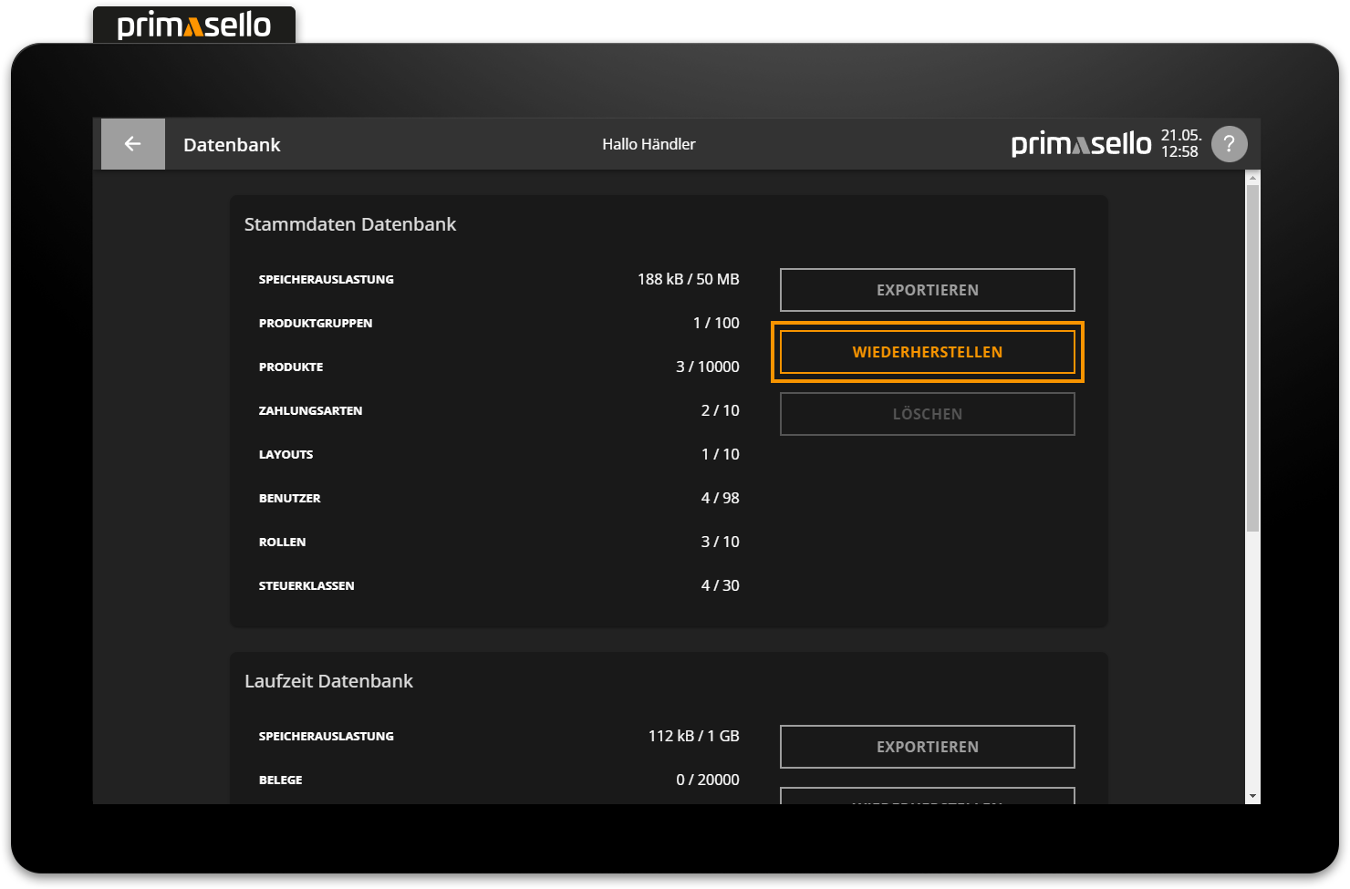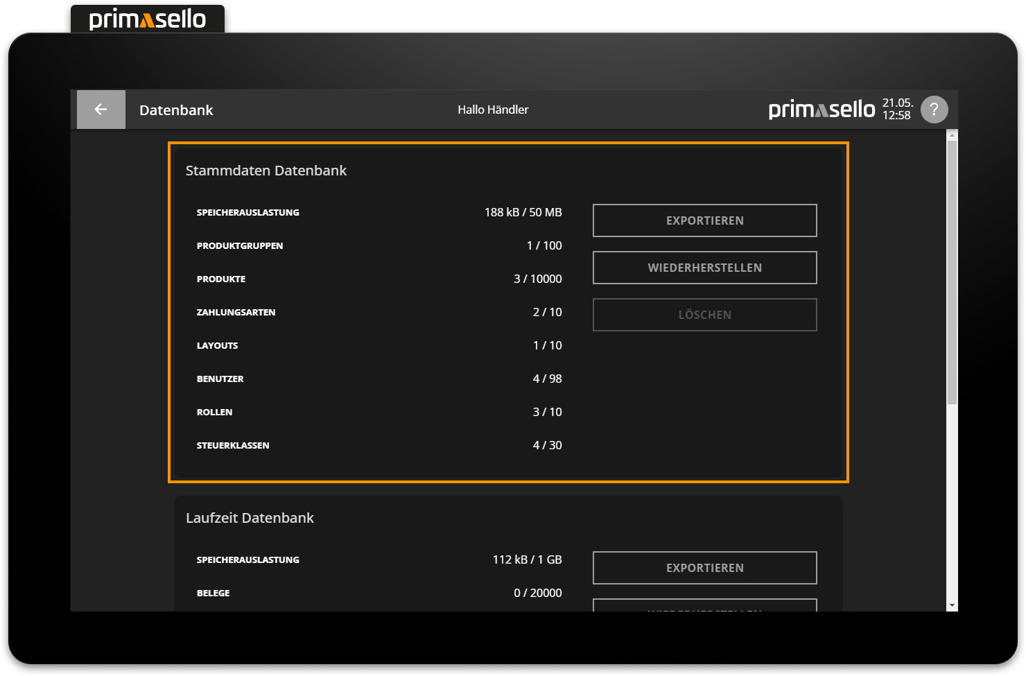 In der primasello Registrierkasse gibt es zwei Datenbanken, in denen alle Daten des Systems gespeichert werden - Stammdaten und Laufzeitdaten.