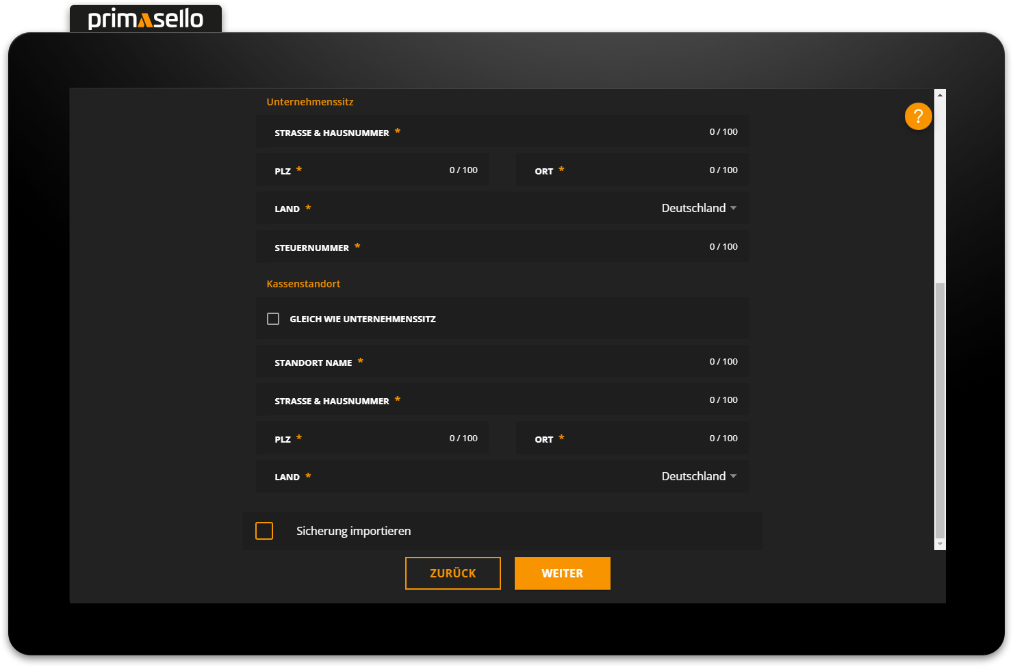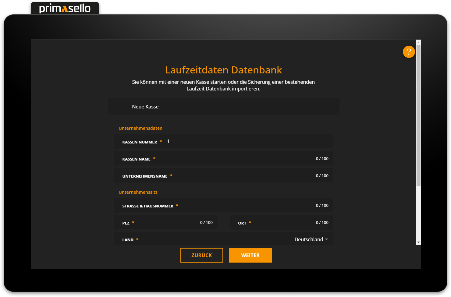 Wird die primasello Registrierkasse eingeschalten, erscheint nach dem Hochfahren des Systems der Willkommens-Bildschirm. In diesem befindet sich im rechten oberen Eck die orange "Hilfe"-Taste mit der die Schnellhilfe aufgerufen werden kann. Darin befinden sich Informationen und Hilfestellungen zu den einzelnen Schritten der Inbetriebnahme.