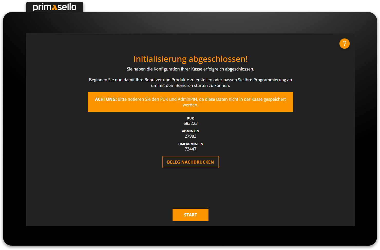 Sind die Daten korrekt wird die Inbetriebnahme durch drücken der orangen "Erstellen"-Taste ganz unten abgeschlossen. Das System speichert die Angaben und erstellt die Datenbanken - dies kann je nach Datengröße einige Augenblicke dauern. Ist die Einrichtung abgeschlossen wird ein Beleg mit den Daten ausgedruckt und es erscheint eine Erfolgsnachricht und die Kasse kann durch drücken der orangen "Start"-Taste ganz unten in Betrieb genommen werden. Sollte kein Beleg mit den Daten automatisch ausgedruckt werden weil zum Beispiel noch kein Belegpapier im Drucker Ihres Geräts eingelegt wurde, können Sie mithilfe der Taste "Daten Nachdrucken" dem Gerät nochmals den Befehl geben die Daten auszudrucken.