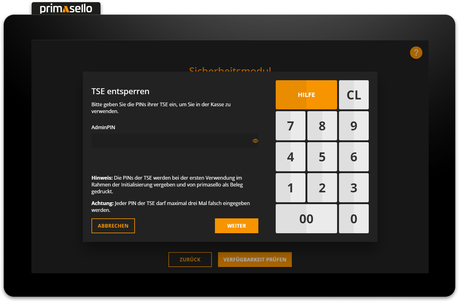 Wird eine TSE an die primasello Registrierkasse angeschlossen, die bereits auf einem anderen Gerät initialisiert wurde, werden der AdminPIN und der TimeAdminPIN der verwendeten TSE benötigt. Es öffnet sich ein Fenster mit der Aufforderung den AdminPIN einzugeben. Dieser kann über die Zehnertastatur an der rechten Seite eingetippt und mit der orangen "Weiter"-Taste bestätigt werden.