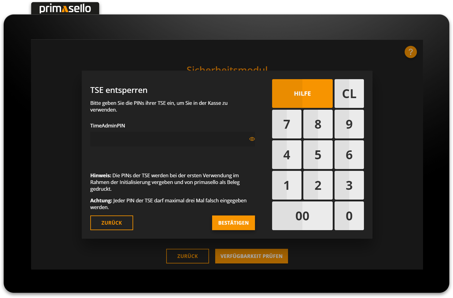 TimeAdminPIN: Der TimeAdminPIN wird für die täglichen Abläufe benötigt (Belege erstellen, Zeit setzen) und wird direkt in primasello gespeichert. Dieser PIN muss nur beim Wechsel der TSE neu gespeichert werden.