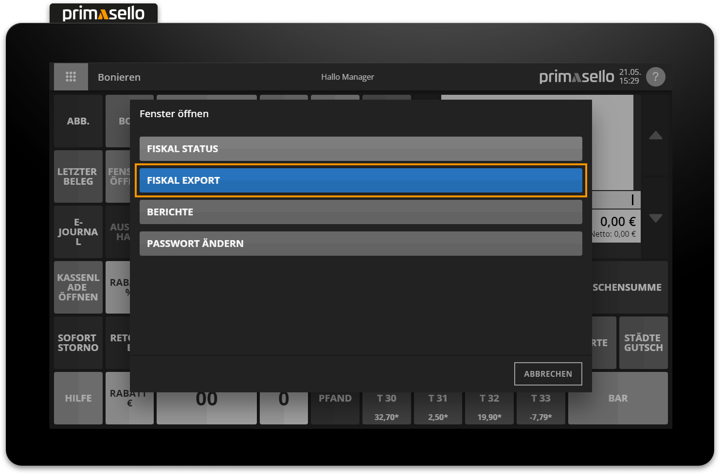 Um die gespeicherten Kassendaten zu exportieren, kann die "Fiskal Export"-Taste auf der Bonieroberfläche oder im Haupt-Menü gedrückt werden. Es öffnet sich ein Fenster, in dem der Datenexport durchgeführt werden kann.