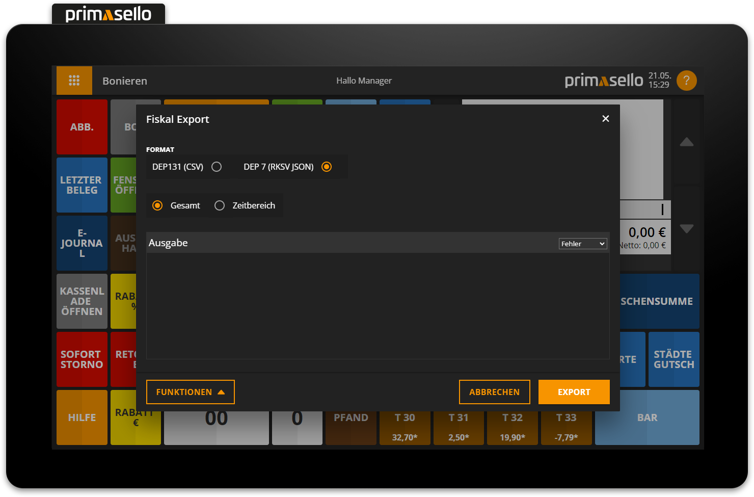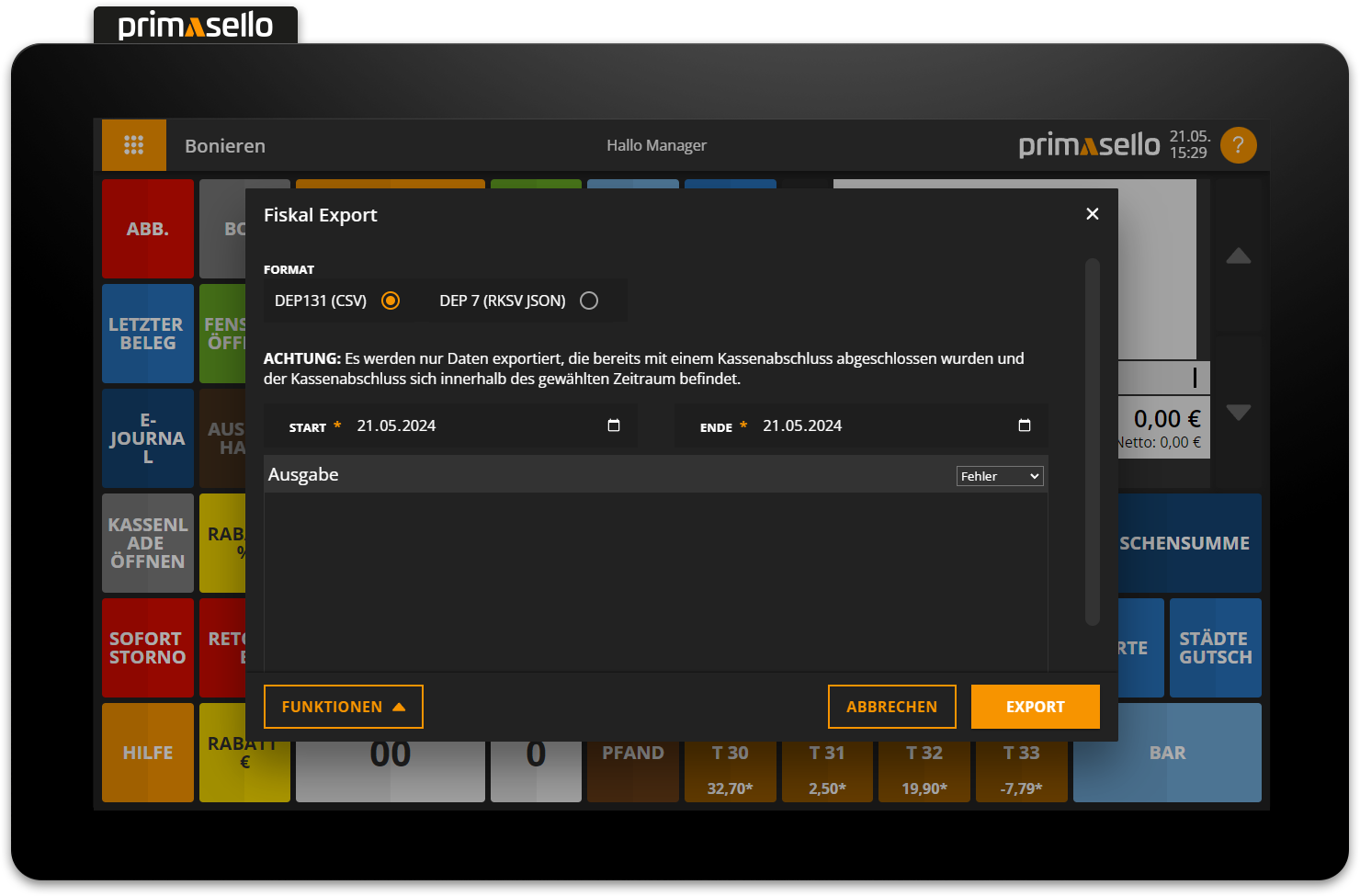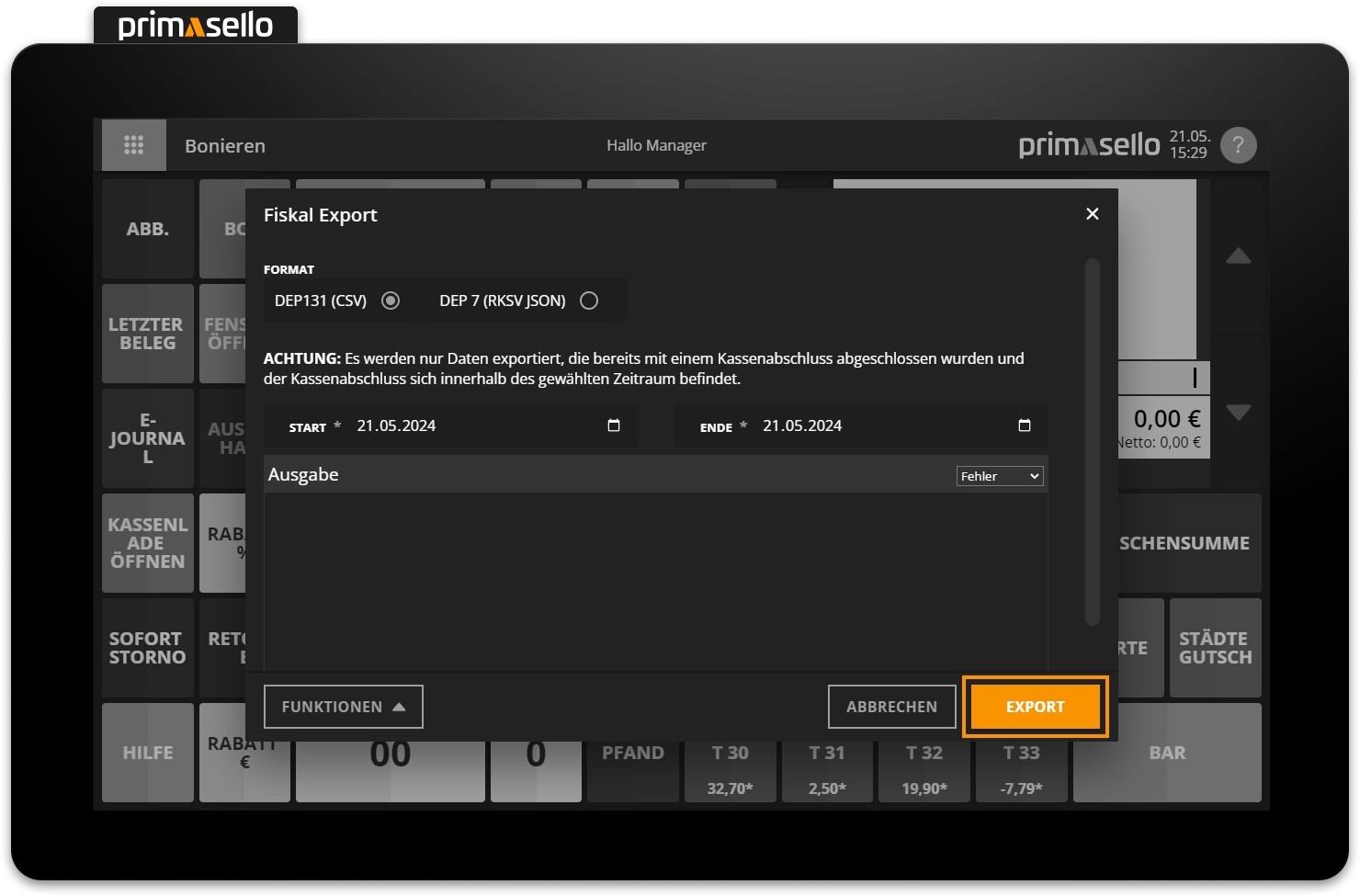 Es werden nur Daten exportiert, die bereits mit einem Kassenabschluss abgeschlossen wurden und der Kassenabschluss sich innerhalb des gewählten Zeitraums befindet.