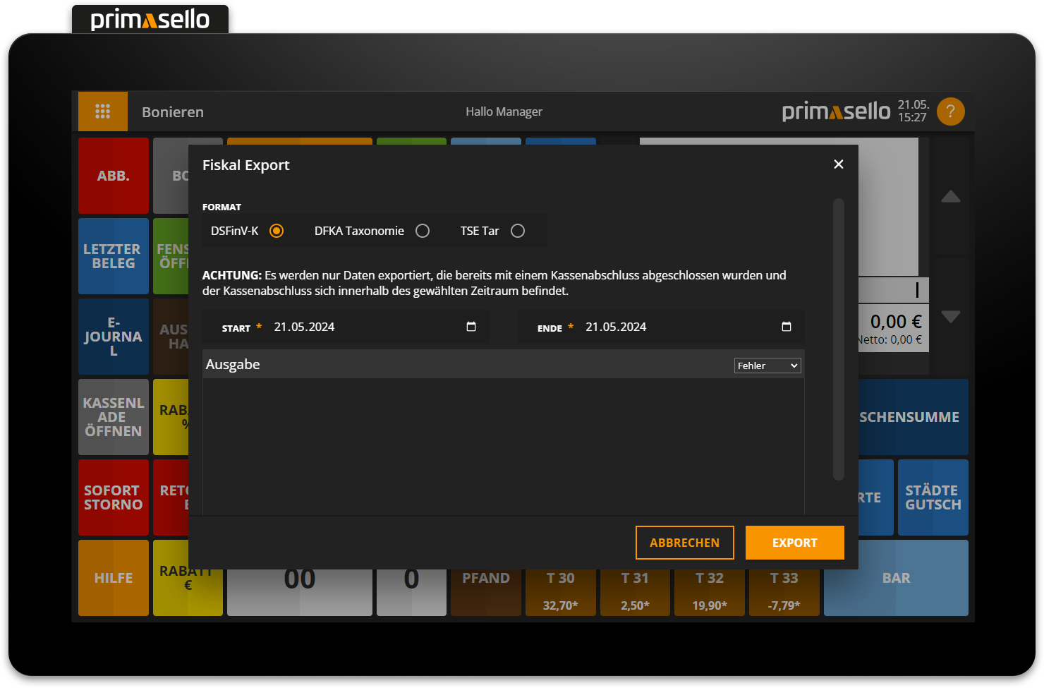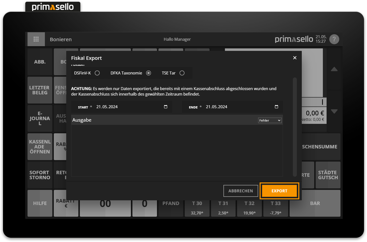 Es werden nur Daten exportiert, die bereits mit einem Kassenabschluss abgeschlossen wurden und der Kassenabschluss sich innerhalb des gewählten Zeitraums befindet.