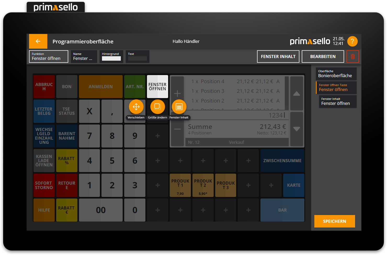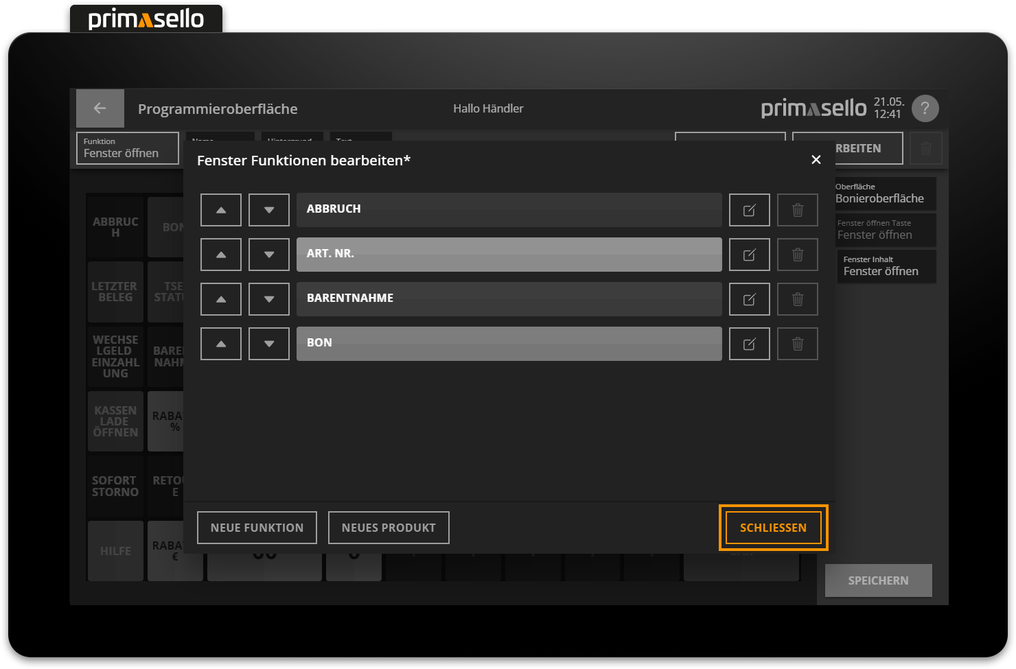 Wird die "Fenster öffnen"-Taste gedrückt, wird über die Bonieroberfläche ein neues Fenster gelegt. In diesem werden weitere Funktionen in einer Liste angezeigt. Es können die gleichen Funktionen und Produkte zum Fenster hinzugefügt werden, die auch auf dem Raster zur Verfügung stehen. Die Funktionen in der Liste können sortiert, umbenannt und eingefährt werden. Es können beliebig viele "Fenster-öffnen" Funktionen auf der Programmieroberfläche platziert werden.