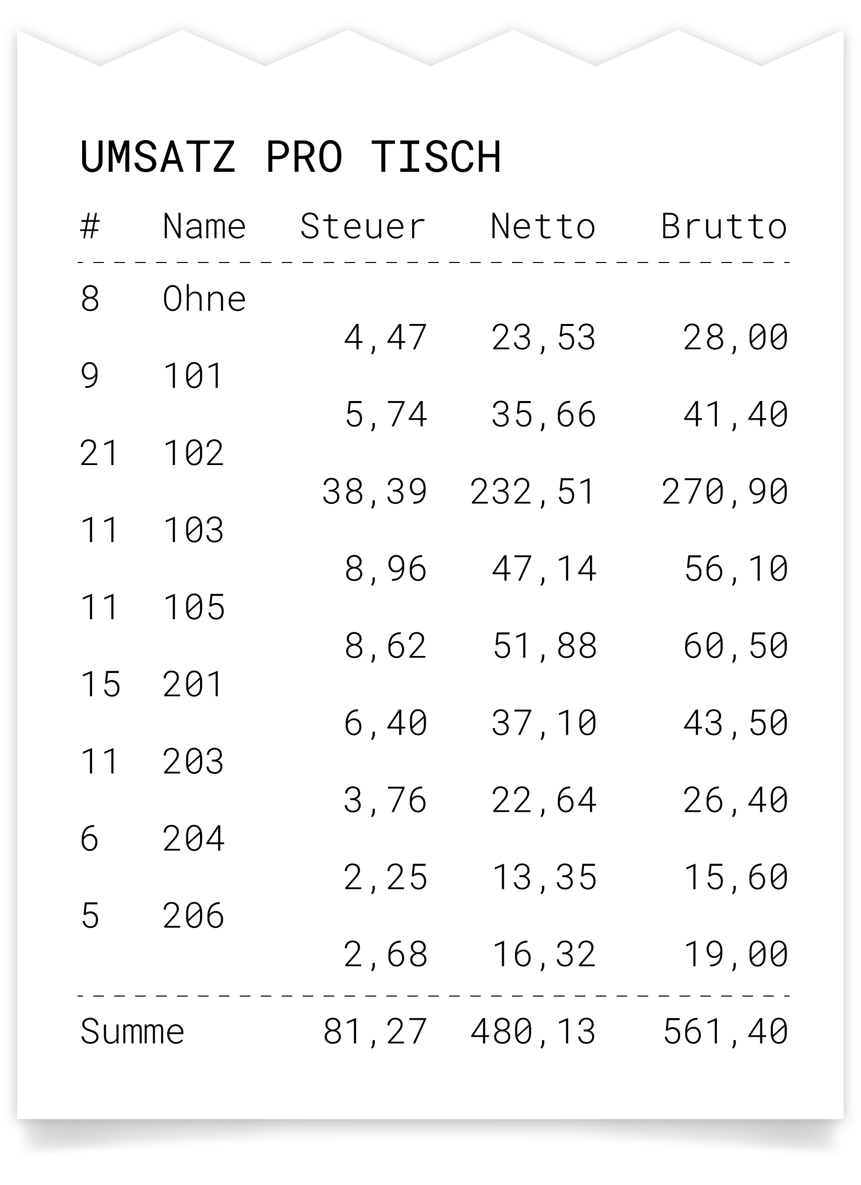Im Abschnitt Umsatz pro Tisch wird die Summe aller erstellten Belege eines Tisches angezeigt. Werden Belege erstellt, ohne zuvor auf einem Tisch geparkt zu werden, werden die Beträge unter dem Namen "Ohne" zusammengefasst.