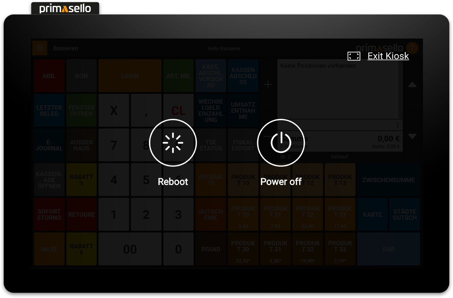 Die primasello Registrierkasse befindet sich immer im Kiosk Modus. Das bedeutet, dass die Kassensoftware im Vollbild gestartet wird und diese auch nicht beendet werden kann. Für gewisse System-Einstellungen kann es notwendig sein, den Kiosk Modus zu beenden, um die "Einstelllungen"-App zu öffnen.