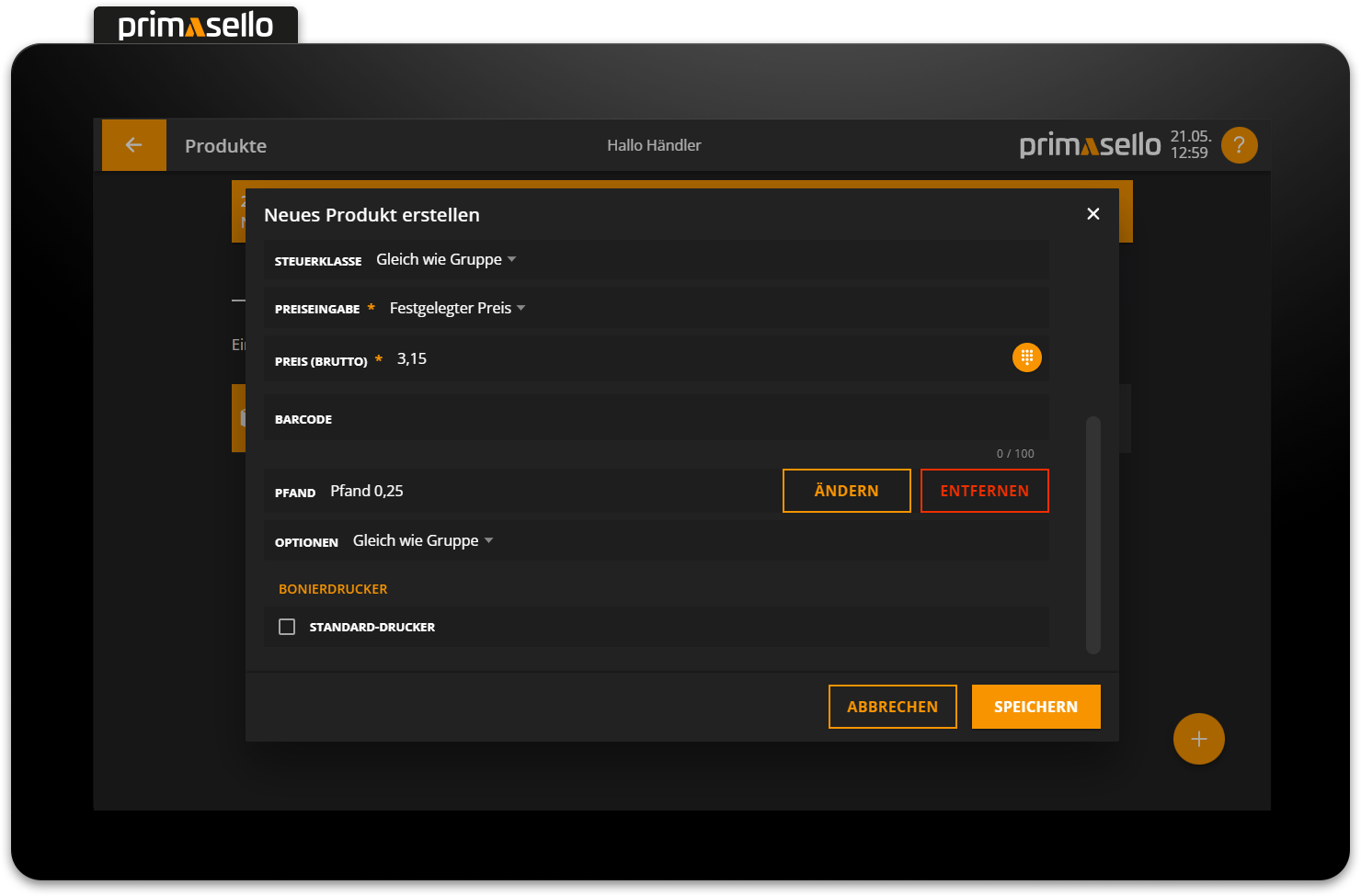 Bei jedem Produkt kann ein Pfand hinterlegt werden, der dann beim Bonieren des jeweiligen Produkts automatisch zum Warenkorb hinzugefügt wird. Im Bearbeitungs-Fenster des Produkts kann im Feld Pfand ein Pfandprodukt verknüpft werden. Wird auf die "Auswählen"-Taste gedrückt öffnet sich ein neues Fenster mit einer Übersicht aller Pfandprodukte. Wird in dem Fenster kein Produkt angezeigt, muss zuerst ein Pfandprodukt erstellt (Produkt mit Geschäftsfall "Pfand") werden. Wird das gewünschte Pfandprodukt ausgewählt, wird dieses als Pfandprodukt zum gewählten Produkt hinzugefügt. Um das verknüpfte Pfandprodukt zu löschen oder zu ändern, kann auf die jeweilige Taste am Ende der Zeile gedrückt werden. Durch Drücken der orangen "Speichern"-Taste rechts unten wird das Produkt mit dem Pfandprodukt gespeichert und beim Bonieren wird der Pfand automatisch zum Warenkorb hinzugefügt.
