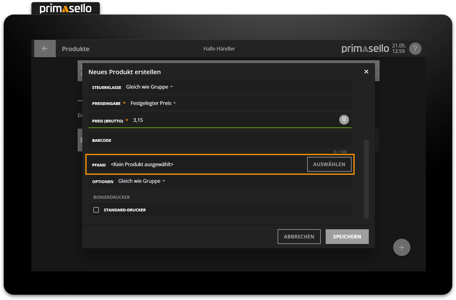 In diesem Kapitel wird das Erstellen und Verknüpfen von Produkten mit Pfand beschrieben.