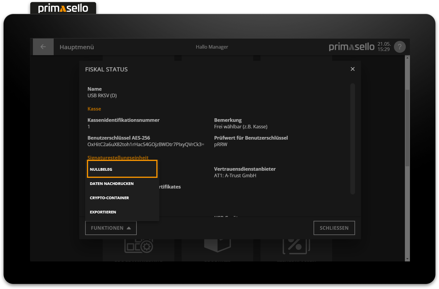Nach Aufforderung durch ein Prüfungsorgan muss ein Nullbeleg erstellt werden. Dieser kann über die "Fiskal Status"-Taste im Funktionsmenü unten links erstellt und ausgedruckt werden. Dabei handelt es sich um eine normale Barrechnung mit dem Umsatz 0.