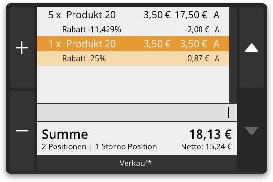Rabatt % | Der Rabatt UND die zugehörige Position (Zwischensumme oder Produkt) werden gelöscht. Die Belegsumme wird um den Betrag der Position erhöht. | Verkauf |