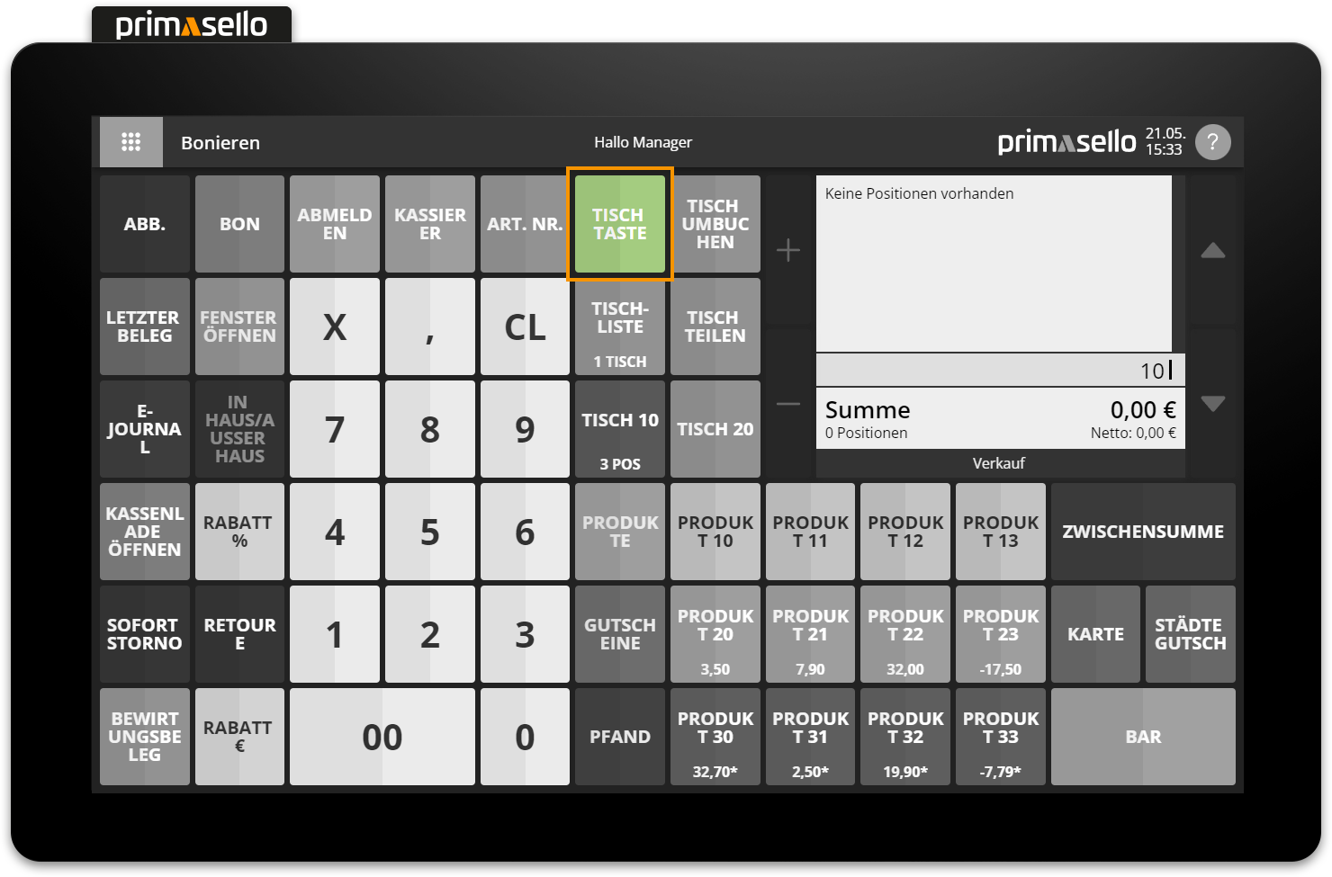 Alternativ zur Eingabe der Tischnummer und Drücken der "Tisch"-Taste, können Tischtasten mit fixen Nummern in der Programmierung konfiguriert werden. Um den Tisch 10 zu Öffnen kann auf die konfigurierte "Tisch 10"-Taste gedrückt werden und der Tisch 10 wird geöffnet.