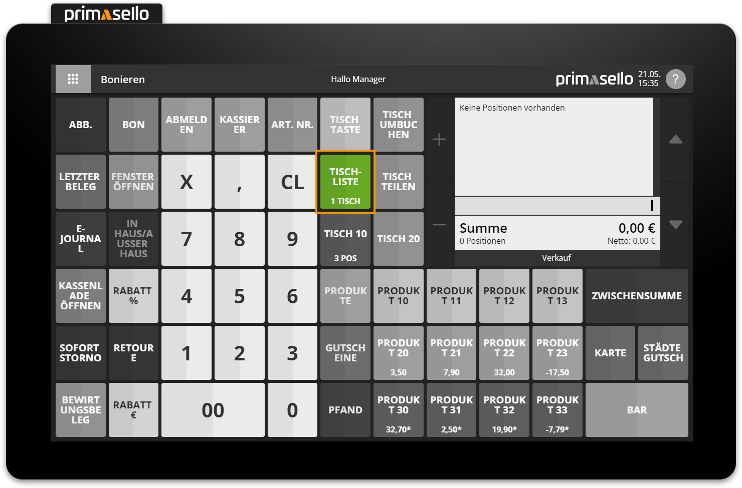 Wie Tische und Tischfunktionen auf der Bonieroberfläche platziert werden können und sogar ein Tischplan erstellt werden kann, wird im Kapitel Programmierung beschrieben.