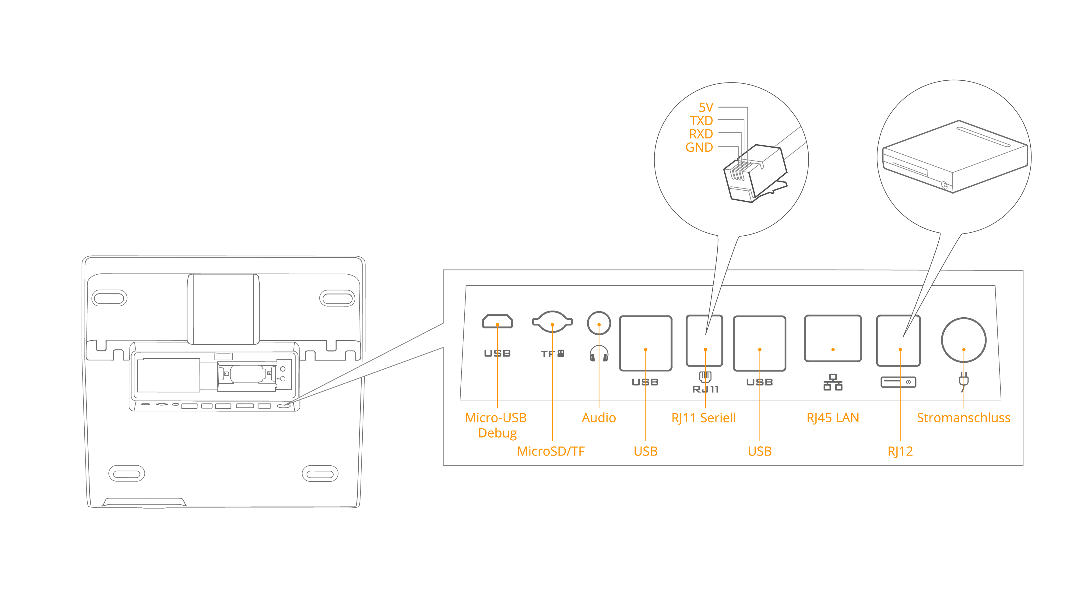 Nur zur Fehlerbehebung des Geräts. Während des Debug-Betriebs funktioniert der USB-Anschluss auf der Unterseite des Geräts nicht. Es kann nur der USB-Anschluss neben dem Einschaltknopf verwendet werden.