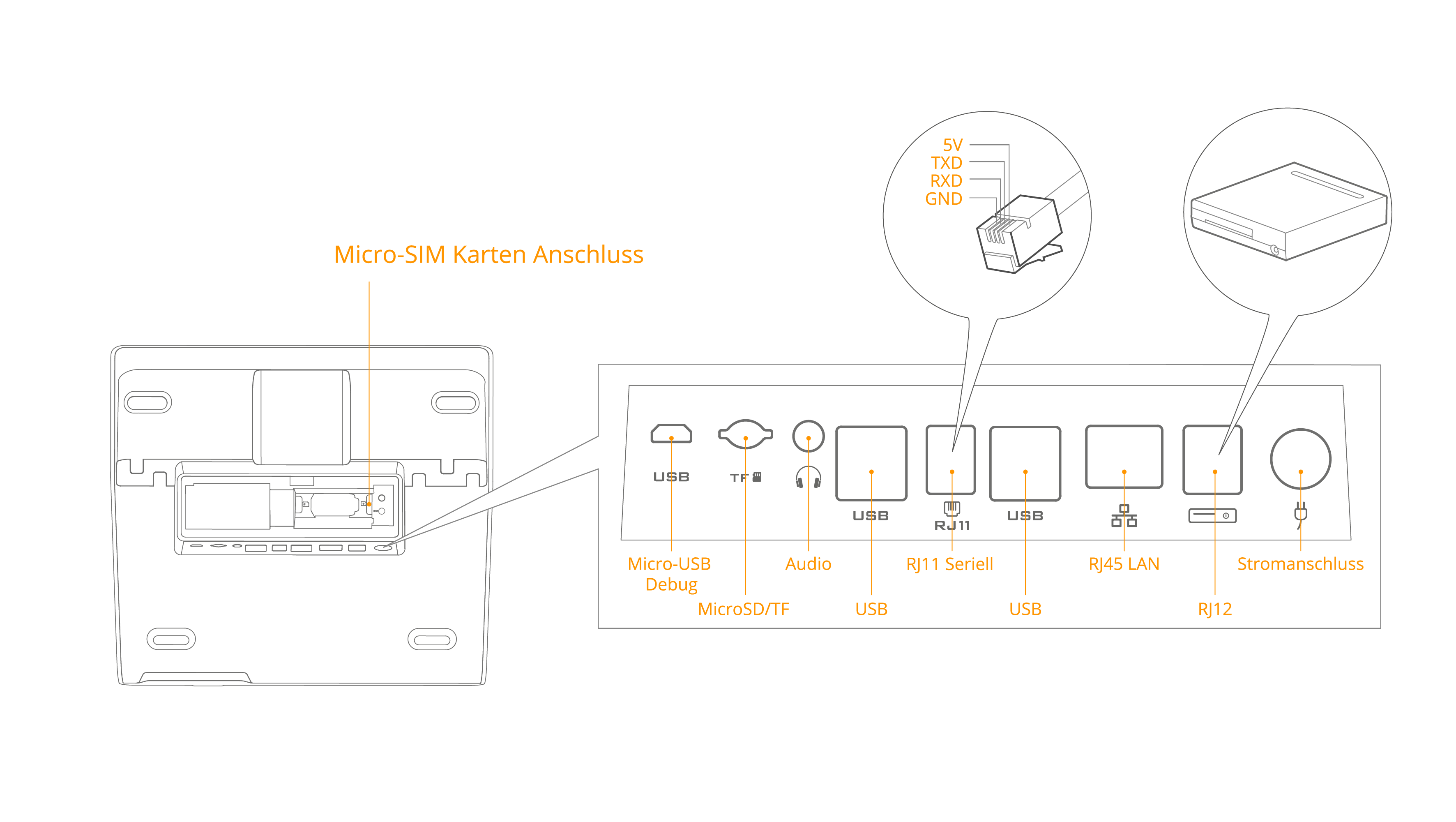 Nur zur Fehlerbehebung des Geräts. Während des Debug-Betriebs funktioniert der USB-Anschluss auf der Unterseite des Geräts nicht. Es kann nur der USB-Anschluss neben dem Einschaltknopf verwendet werden.