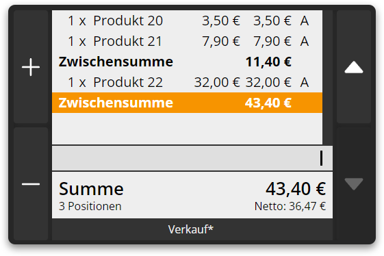 Während der Erstellung eines Beleges kann jederzeit die Zwischensummen-Funktion aufgerufen werden. Dadurch wird eine Position zum Beleg hinzugefügt, die eine Summe aller bereits hinzugefügten Produkte und Rabatte anzeigt. Die Zwischensumme wird auf dem Kundendisplay angezeigt und auf dem Beleg gedruckt.