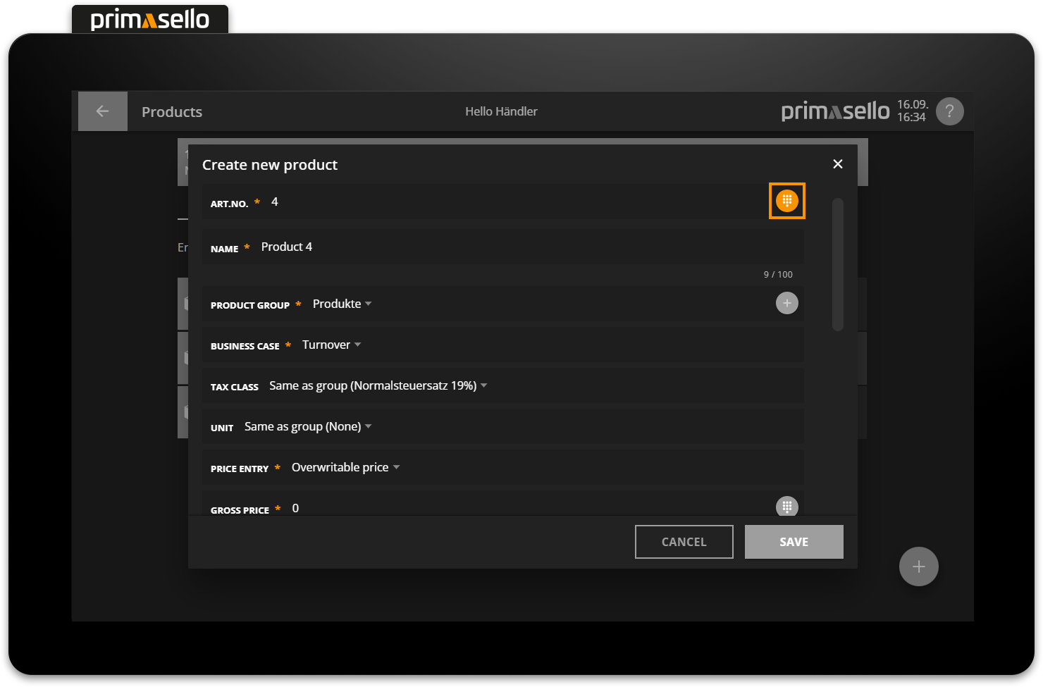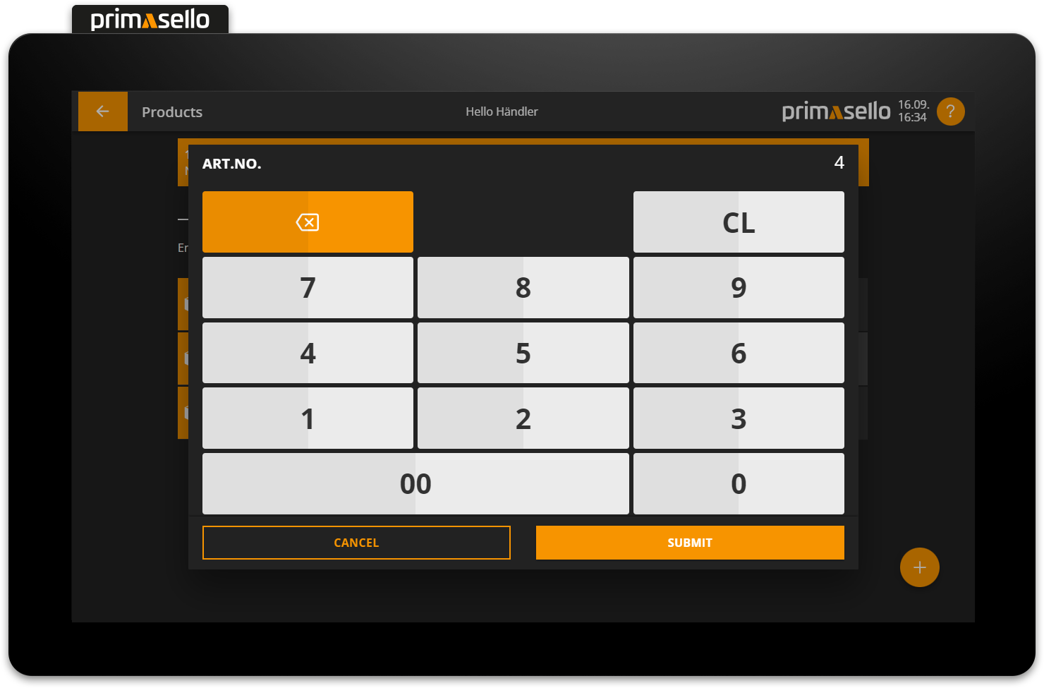 Pressing this opens a new window with the numeric keyboard. All numbers can be entered as usual using this keypad. Amounts are entered in cent (without a comma), while percentages may be entered with a decimal point (with a comma).