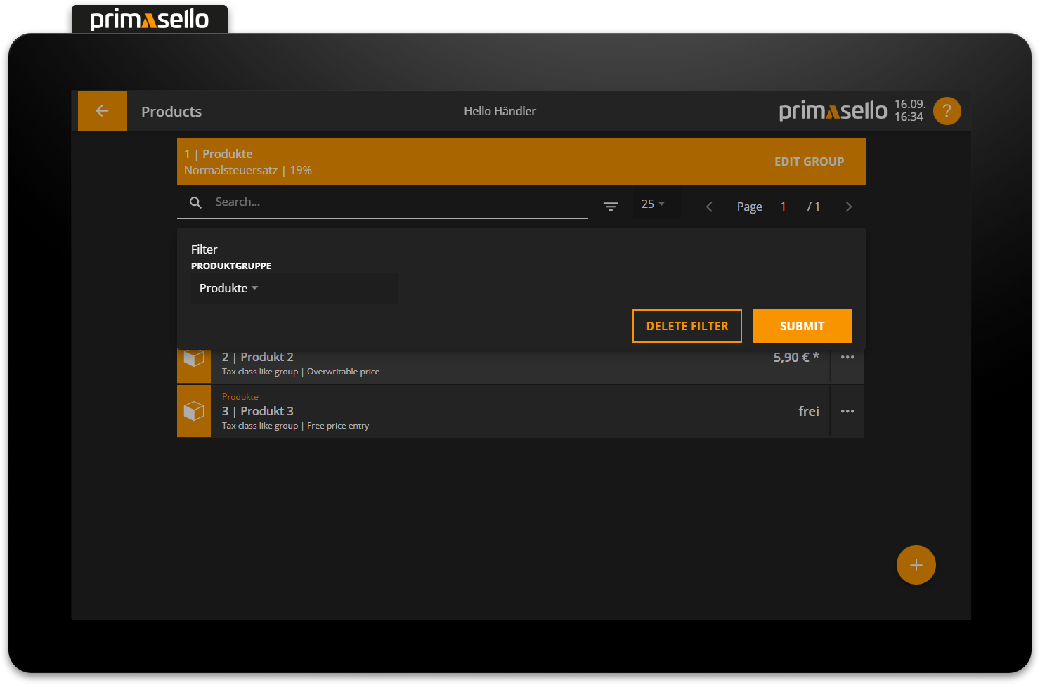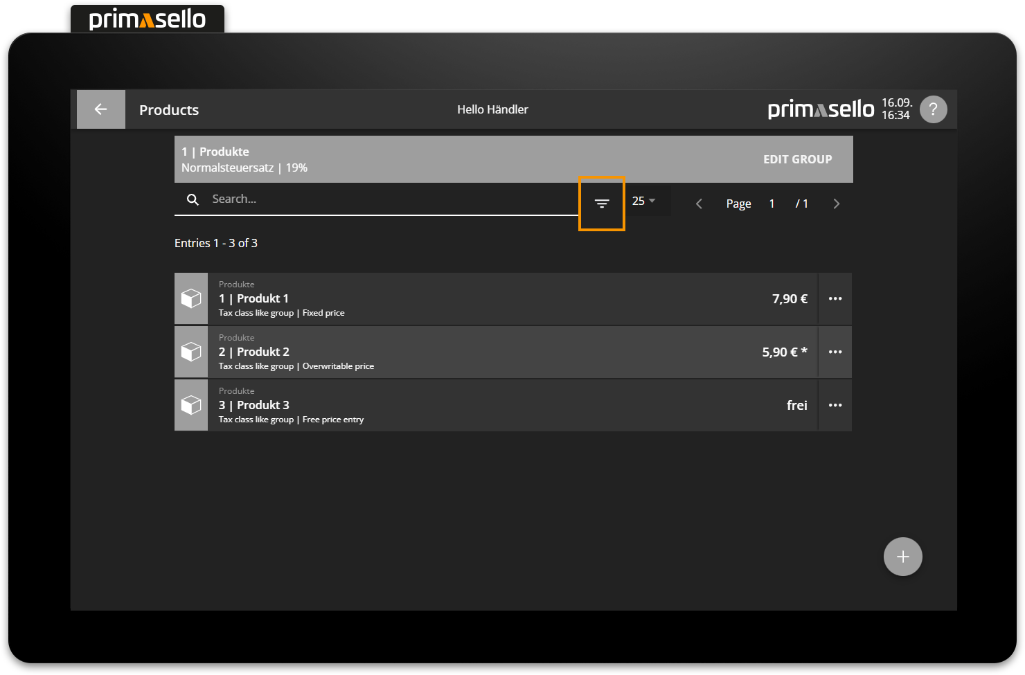 The entries per page are limited to 25 entries by default. This number can be changed using the selection field at the right edge of each list. You can choose between 25, 50 or 100 entries per page.